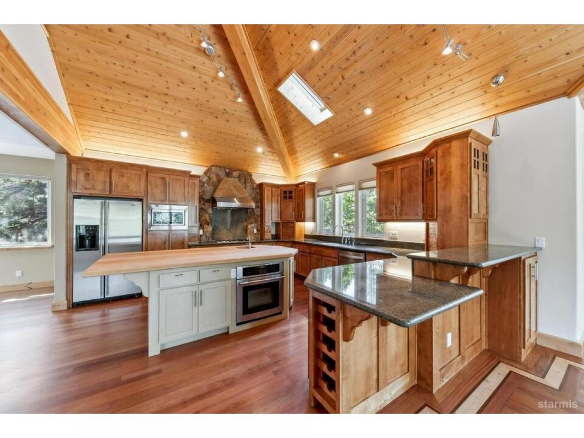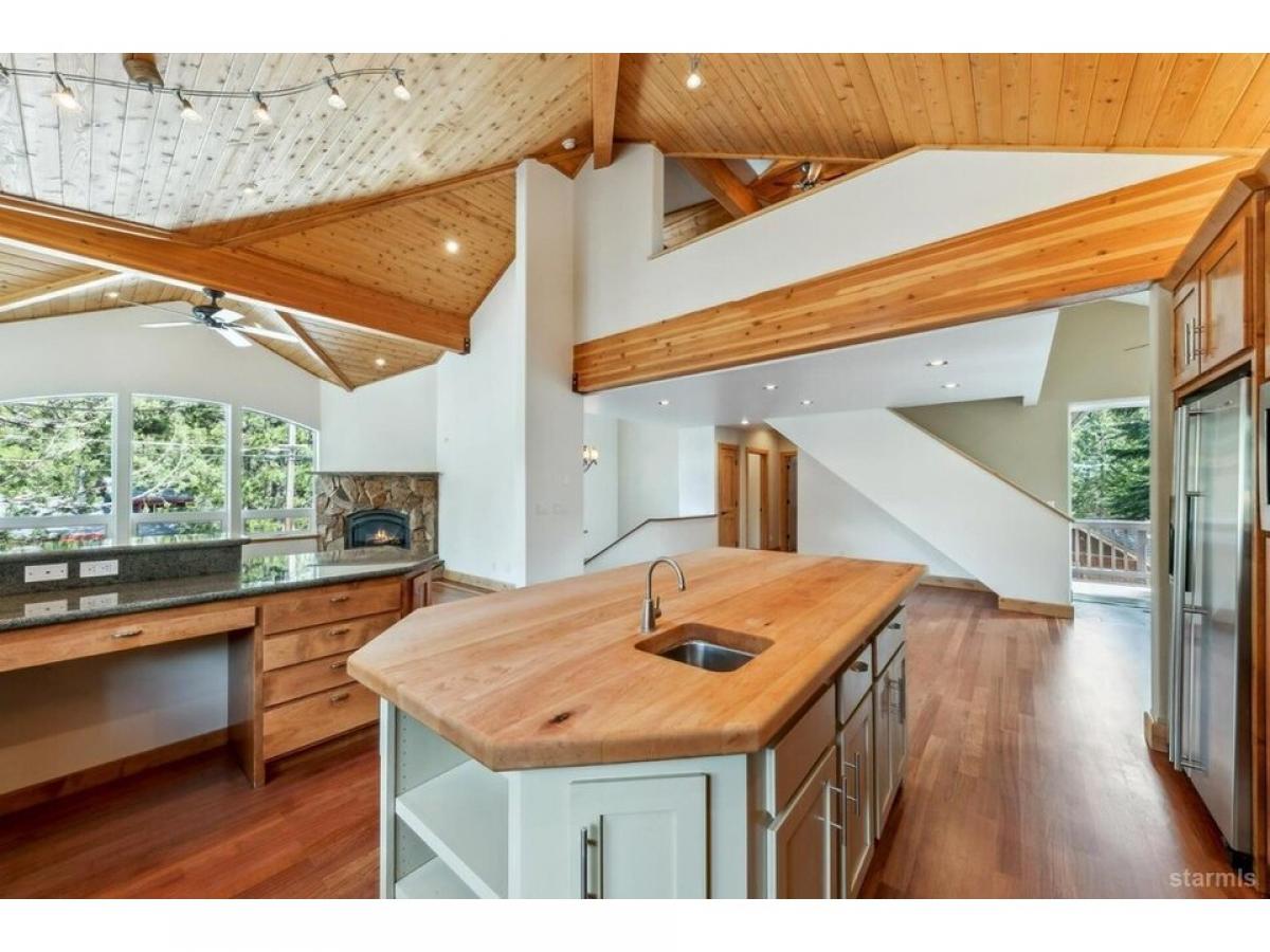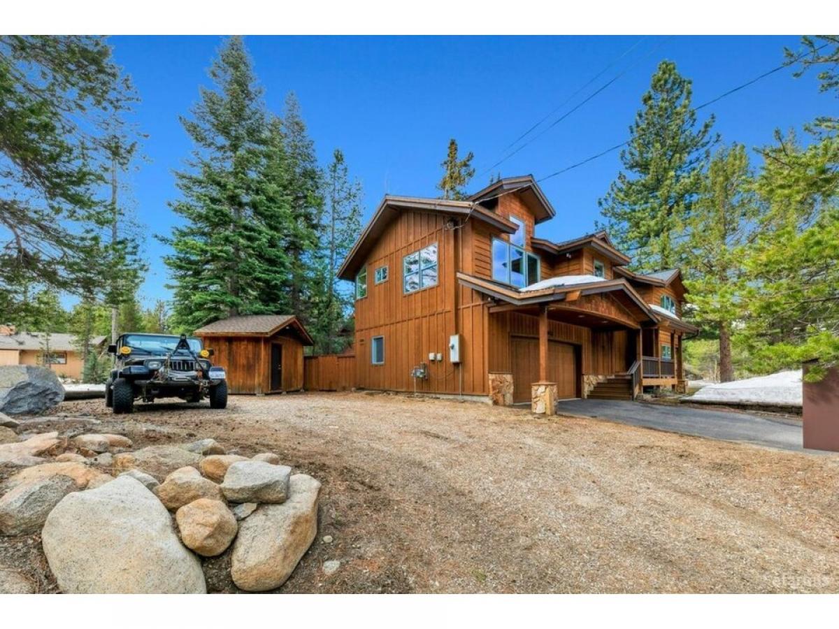 Experience timeless craftsmanship and refined mountain living in this exceptional owner-built custom home, ideally situated just steps from the Upper Truckee River with direct access via a Forest Service lot across the street. This architectural gem showcases dynamic design, exquisite woodwork, and high-end finishes throughoutoffering the quintessential Tahoe lifestyle. A welcoming covered front porch leads to a grand entrance framed by double solid-core knotty alder doors, opening into a dramatic foyer that rises into a stunning great room with soaring rooflines and a striking display of custom millwork. At the heart of the home, the chef-inspired kitchen is equipped with premium Jenn-Air stainless steel appliances, including a 36-inch side-by-side refrigerator, 5-burner gas cooktop with commercial-grade range hood, dual ovens, and a statement butcher block islandperfect for both entertaining and everyday gourmet cooking. The spacious top-floor primary suite offers a tranquil retreat, featuring a jetted tub and luxurious triple-head shower. A nearby second bedroom, full bathroom, and an open loft area provide additional comfort and flexibility. Downstairs, a second living room anchors the ground floor, alongside two more bedrooms, a full bathroom, and a functional laundry room. Additional highlights include energy-efficient Hunter Douglas blinds throughout, an oversized two-car garage with solid-core wood doors, and a matching exterior storage shed. This is a rare opportunity to own a thoughtfully crafted mountain home, designed for outdoor enthusiasts with refined tastes.