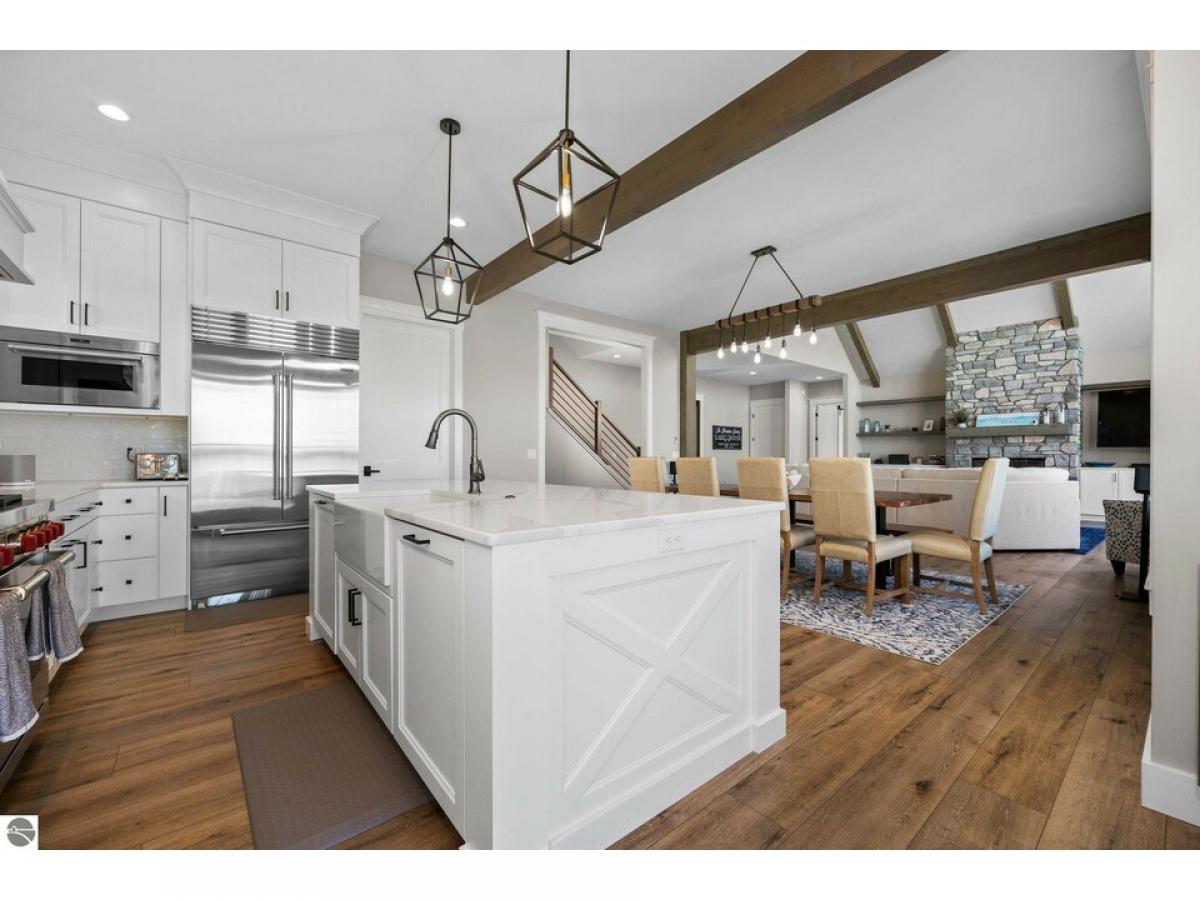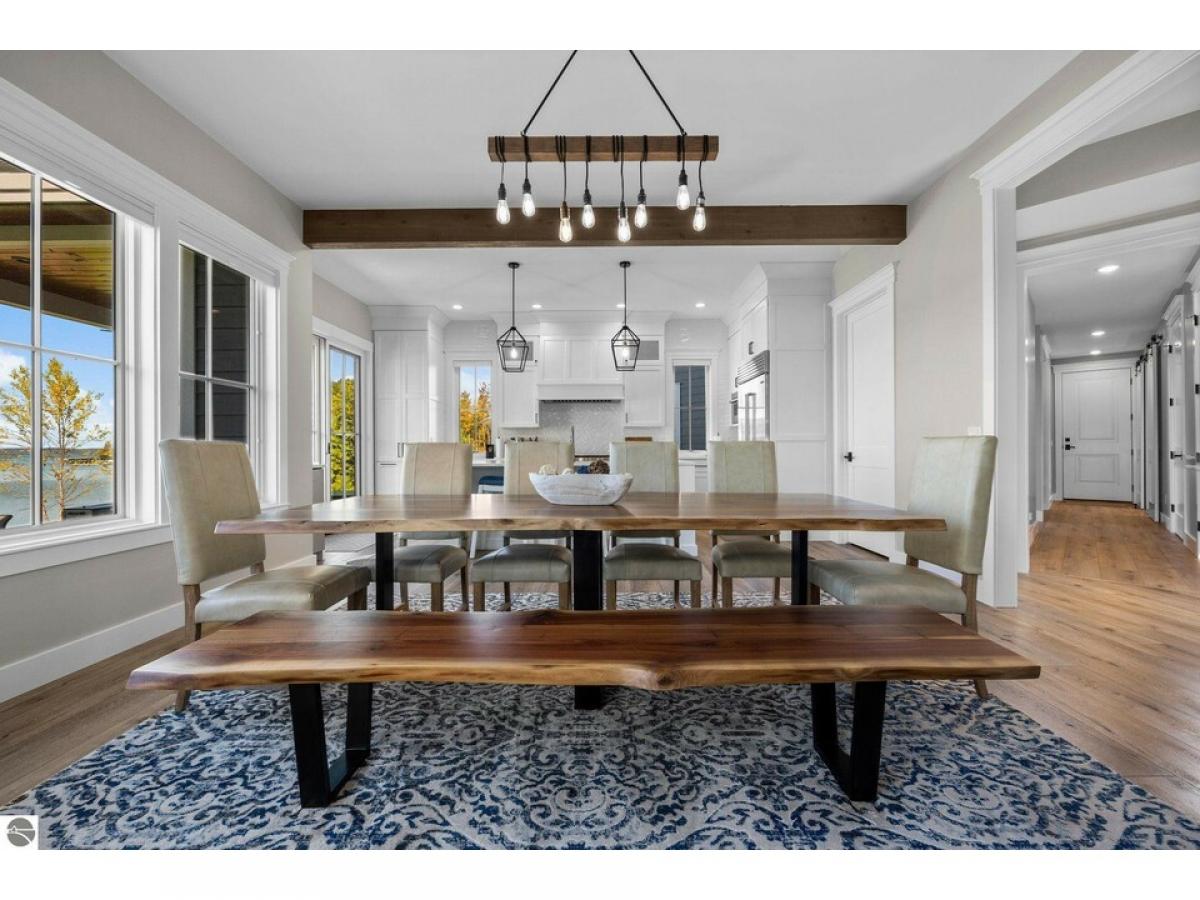 This stunning home sits on the east shore of beautiful Torch Lake, just north of the quaint town of Alden. Imagine spending a month here, enjoying the crystal blue water and beautiful sunsets after a hard day on the turquoise waters, boating, tubing, and swimming, or returning to this exquisite home and rinsing off after a day in the saddle. This newer home is in a private neighborhood on a dead end road. Decorated in the perfect "Lake Living" decor. This spacious open floor plan home is great for the larger family to enjoy. There are 2 Primary en-suites, a total of 5 large bedrooms, 4 1/2 baths. Large living room area with separate TV viewing area upstairs. The outdoor space is fabulous! Large lakeside patio with covered grilling area, several seating areas, a gas table top firepit, as well as a separate large stone seating area with fire pit. Great yard for the kids to play. The location couldn't be better. You are about 30 minutes to Traverse City, and 20 minutes to Flintfields. No pets and no smoking. Minimum 30 nights stay.
