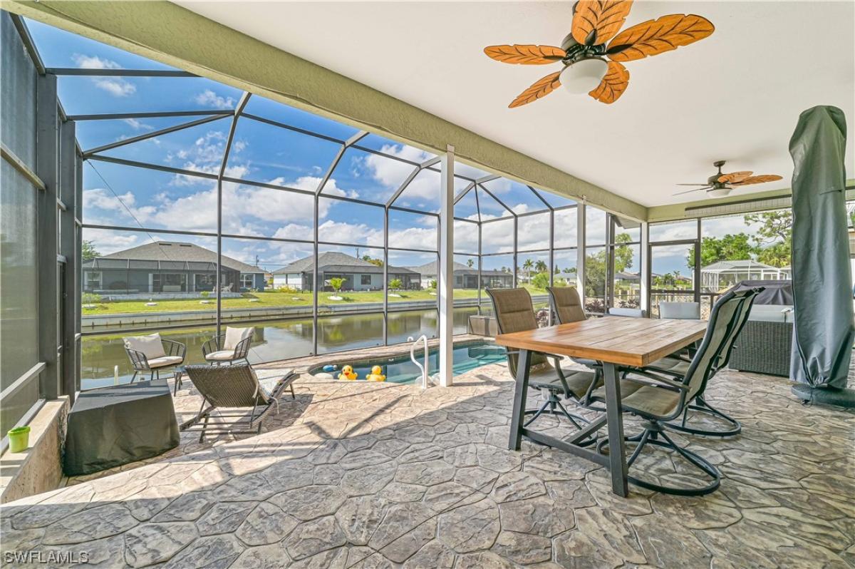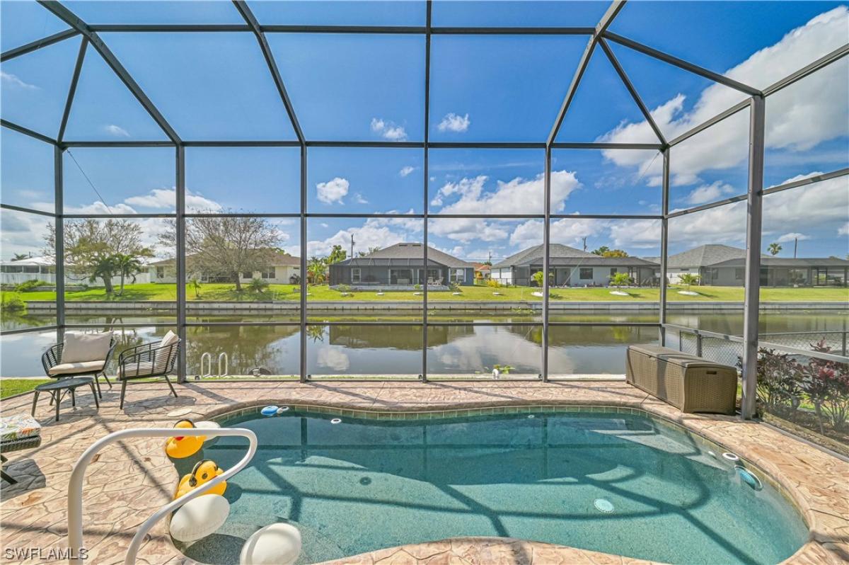 YES!!! Schedule a SHOWING..... WOW...PRICED TO GO..!! What a BEAUTIFUL home. No flood insurance required..Indulge in the epitome of luxury and Florida Living with this stunning 4-bedroom, 2-bath sparkling Freshwater Canal front Pool home, where all assessments are paid in full and did I mention the pool is WEST facing for you to enjoy. Step through French doors into a realm of true Florida Living as the open floor plan, adorned with premium tile flooring, seamlessly leads you through a space graced by vaulted ceilings, welcoming an abundance of natural sunlight. This expansive home offers large bedrooms with a split floorplan for privacy. Begin with Immersing yourself in culinary delights within the expansive kitchen, where amazing water views complement exquisite granite countertops, large formal dining as well as a stylish breakfast bar, and a charming breakfast nook that looks out over the pool and canal. An ample walk-in pantry, coupled with plenty of cabinets for oversized kitchen essentials, enhances the culinary experience. Embrace sustainable living with the integrated solar electricity panels, contributing to minimal electric bills and environmental consciousness. As the day unfolds, relish in the captivating Florida sunsets from the comfort of your breathtaking EAST FACING screened-in pool and lanai—an idyllic retreat for both relaxation and entertainment. This residence stands as a testament to modern luxury, where every detail has been meticulously curated for the utmost in comfort and sophistication. Schedule your exclusive appointment today and seize the opportunity to call this solar-powered haven your home. Don't miss out on the chance to experience a lifestyle of unparalleled elegance here in beautiful Cape Coral—your oasis awaits! Some restrictions on showings apply due to family situation.