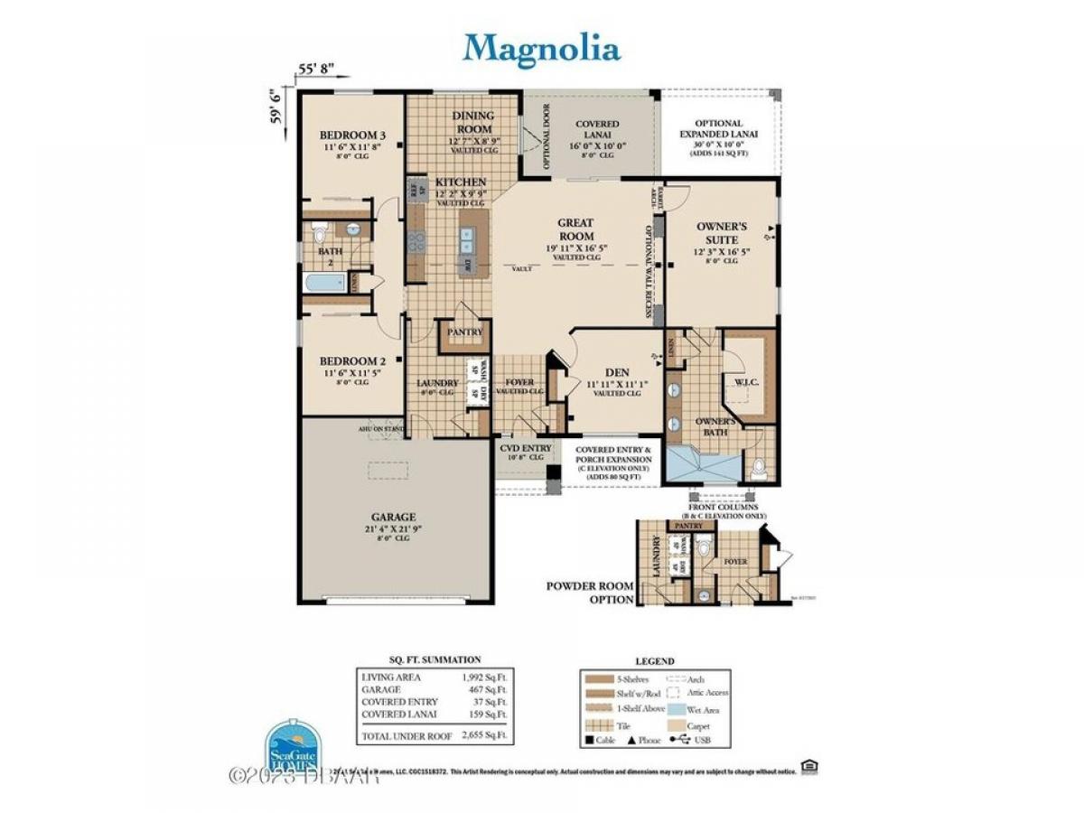 This beautiful Magnolia plan offers an open floor plan with flush kitchen island-top that overlooks the spacious great room. The kitchen upgrades include stainless steel appliances, 42 inch cabinets with increased depth and staggered installation. Upgrades also include luxurious laminate in the main areas, quartz counter tops in the kitchen and private owners suite with sizable walk-in closet and raised vanity accented by upgraded cabinets, this home offers a powder bath, large expanded covered lanai and sprinkler system.