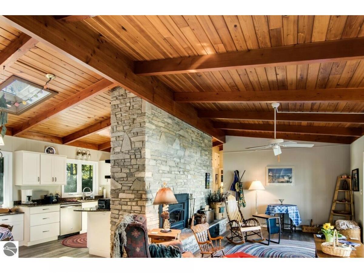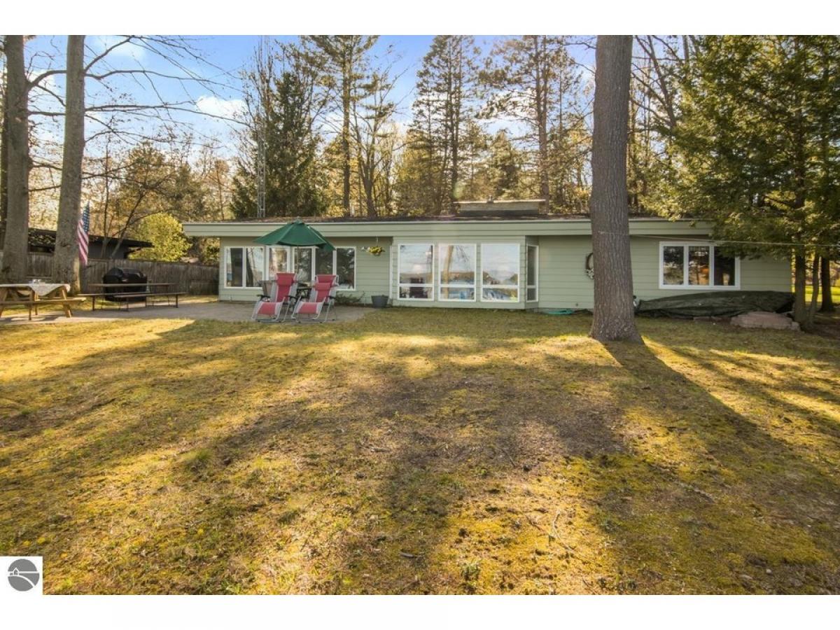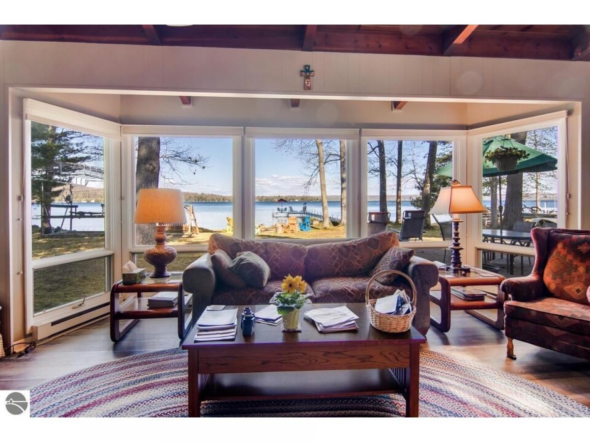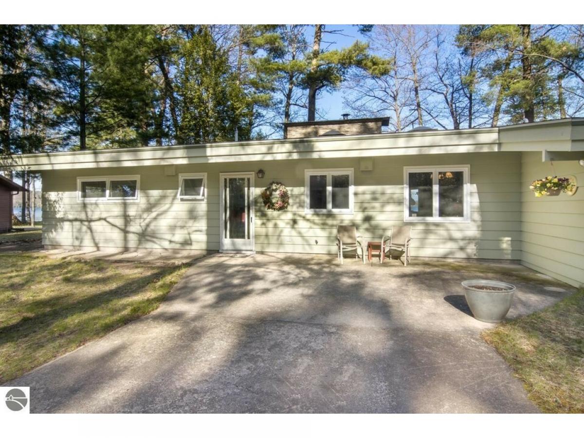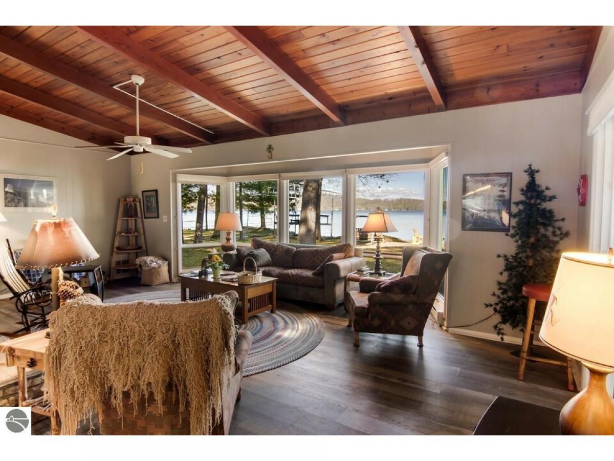 SPECTACULAR SUNRISE VIEWS will be yours to enjoy with your morning coffee from this newly listed home on the shores of Lake Skegemog. A secluded Skegemog Point setting will welcome you and your family to premier lakefront living. A mid-century style home with a cozy cut stone fireplace in the living room with wood burning heating insert; expansive windows for stunning views; beamed wood ceilings; a heated sun porch; 3 bedrooms, 2 baths; laundry room; and the ease of one-floor living. Charming kitchen with versatile white cabinetry, granite countertops, stainless appliances slate color and built-in bench seating. The oversized, detached 2-car garage provides plenty of storage for your water toys. Spend your evenings around the beachside firepit while making s’mores and watching the fireflys. You will enjoy a deep wooded lot, spacious patio and a large yard perfect for hosting your next barbecue with family and friends. Imagine sitting on your dock while enjoying the serene setting and 100 feet of sandy lake bottom frontage, perfect for a variety of waterfront activities and access to the entire Chain-of-Lakes for hours of boating fun. This is the place you will create new family traditions and memories from your piece of “up north” paradise.