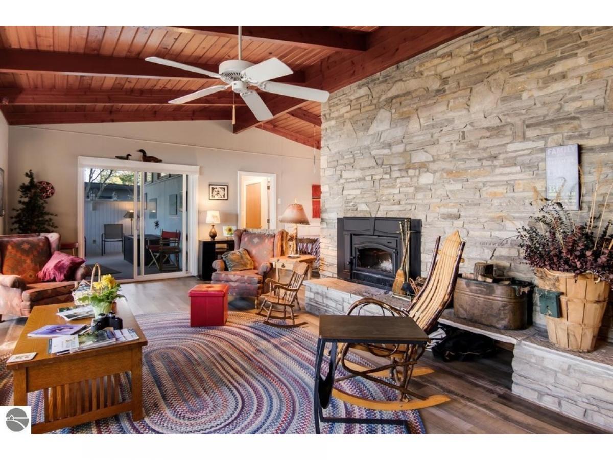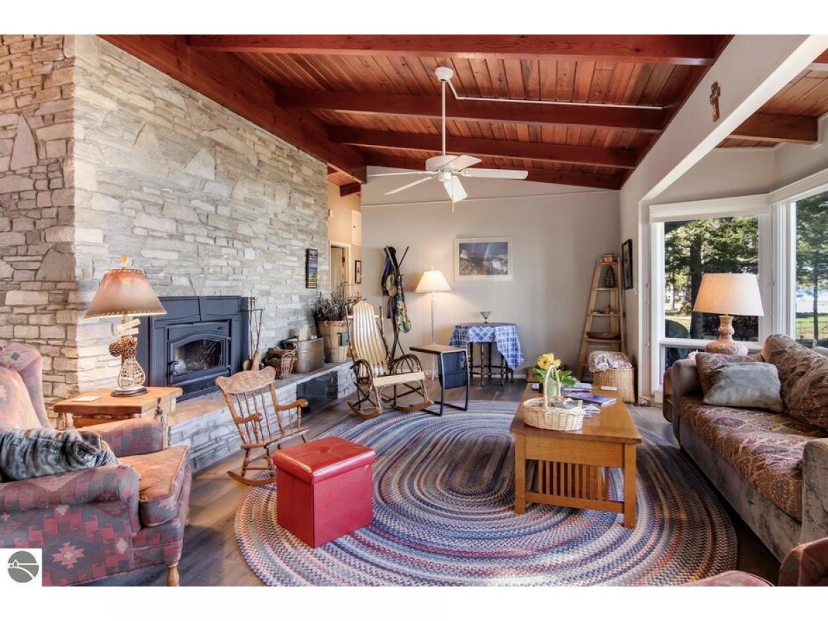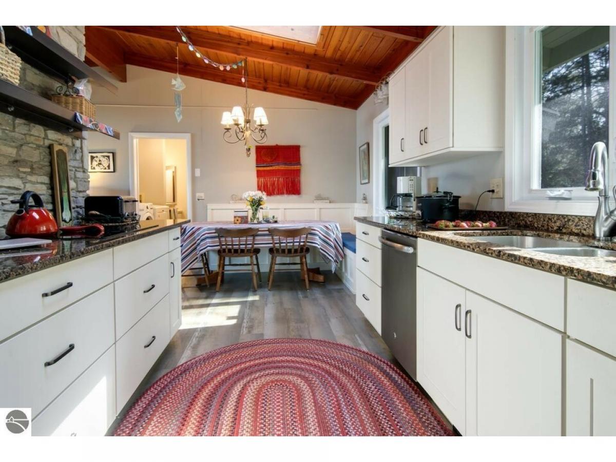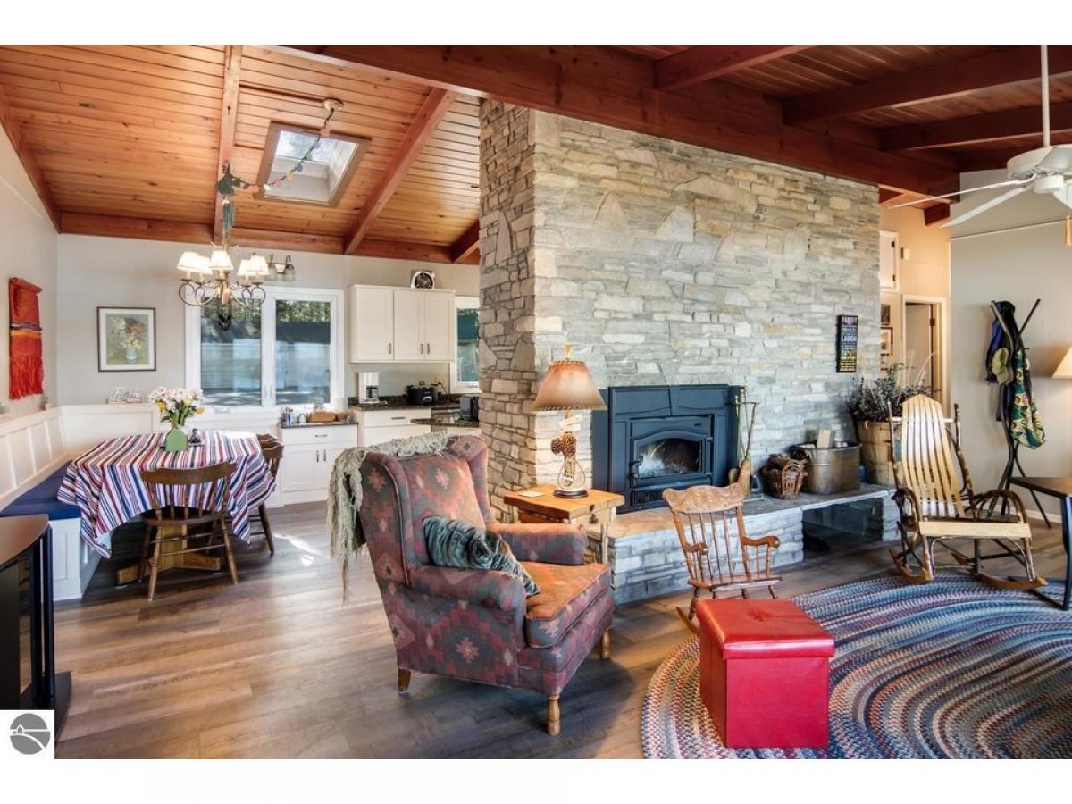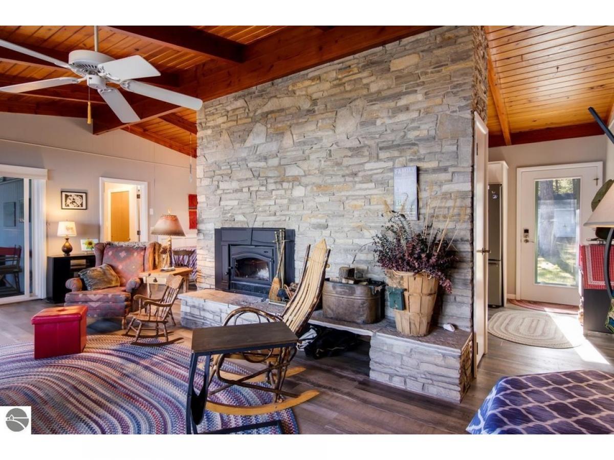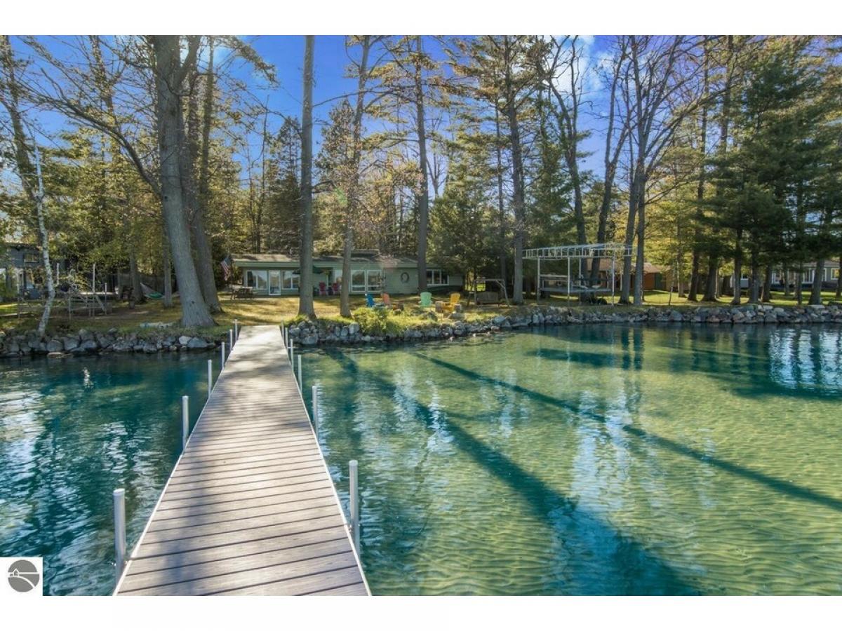 SPECTACULAR SUNRISE VIEWS will be yours to enjoy with your morning coffee from this newly listed home on the shores of Lake Skegemog. A secluded Skegemog Point setting will welcome you and your family to premier lakefront living. A mid-century style home with a cozy cut stone fireplace in the living room with wood burning heating insert; expansive windows for stunning views; beamed wood ceilings; a heated sun porch; 3 bedrooms, 2 baths; laundry room; and the ease of one-floor living. Charming kitchen with versatile white cabinetry, granite countertops, stainless appliances slate color and built-in bench seating. The oversized, detached 2-car garage provides plenty of storage for your water toys. Spend your evenings around the beachside firepit while making s’mores and watching the fireflys. You will enjoy a deep wooded lot, spacious patio and a large yard perfect for hosting your next barbecue with family and friends. Imagine sitting on your dock while enjoying the serene setting and 100 feet of sandy lake bottom frontage, perfect for a variety of waterfront activities and access to the entire Chain-of-Lakes for hours of boating fun. This is the place you will create new family traditions and memories from your piece of “up north” paradise.