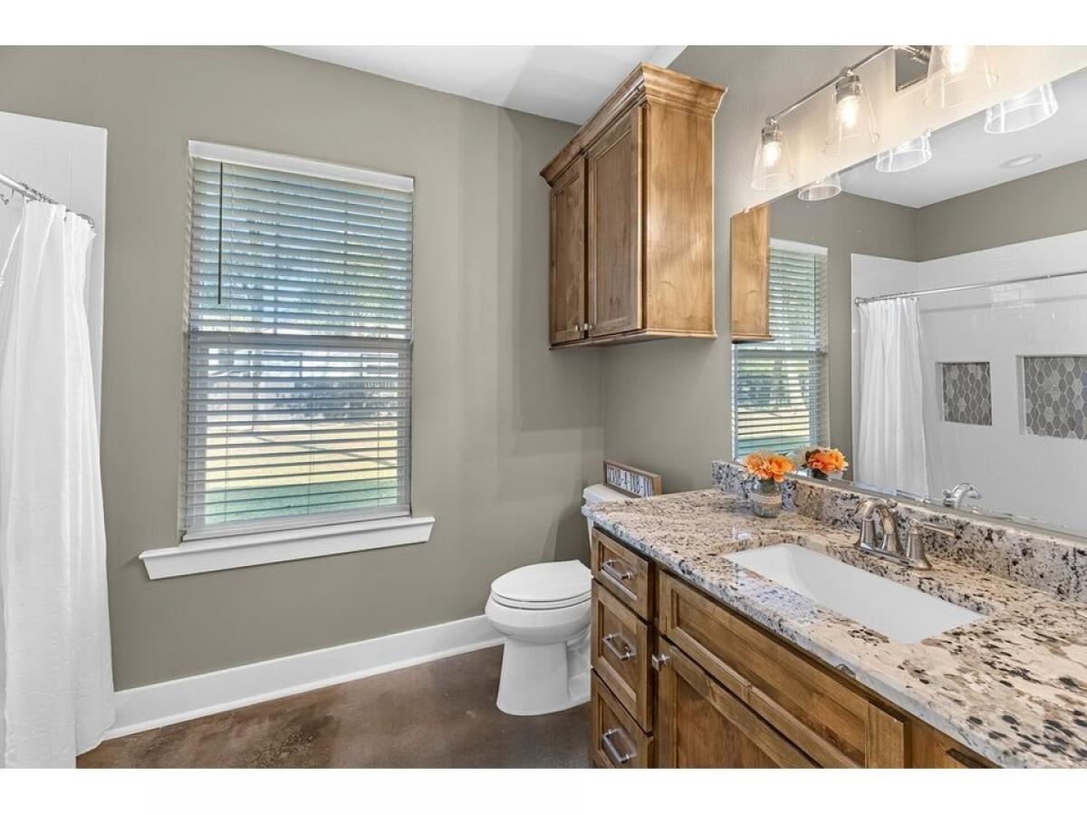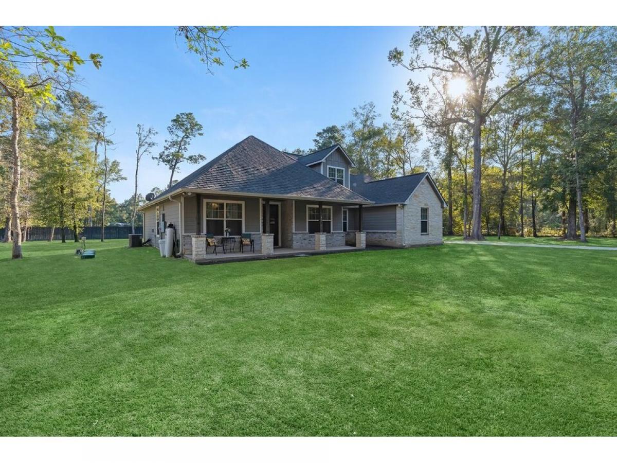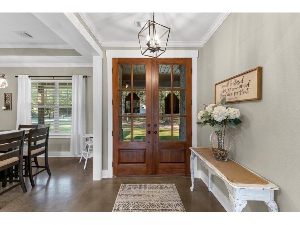 This beautiful 1.5-story home sits on a full acre offering 4 bedrooms, and 2.5 baths. Featuring high ceilings and concrete floors throughout, creating a modern, open feel. The gourmet kitchen is equipped with granite countertops, a charming farm sink, and ample cabinet storage. Water filtration system installed, built out attic for storage. Natural light floods the interior, highlighted by a grand double front door. Two AC units to maximize comfort inside the home. Outside, enjoy a covered front porch, a large back patio, and a fully fenced yard with included play structure. The exterior showcases brick, and stone finishes, while a Porte-cochere and double driveway offer ample parking. Backyard is ready for your shop today!
