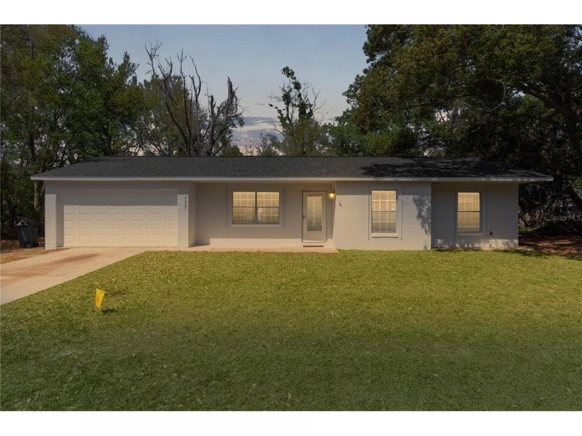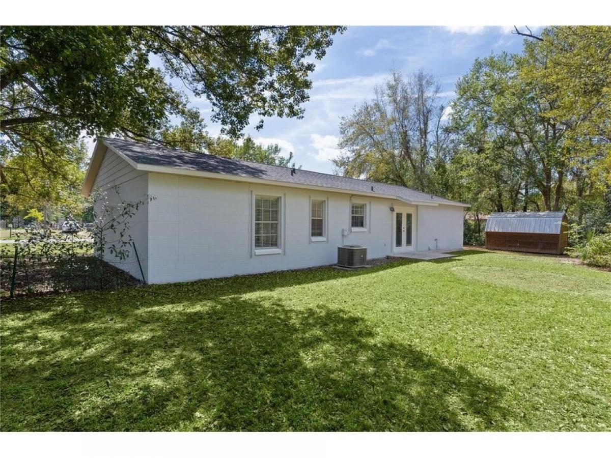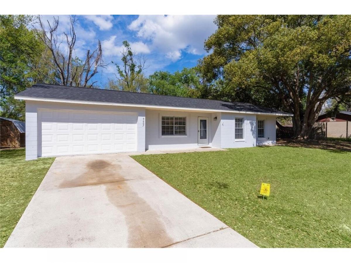 Under contract-accepting backup offers. Fabulous 3 bedroom, 1 frac12; bathroom block home nestled on a large corner homesite. Featuring a one car garage, private backyard with large shed. BRAND NEW ROOF 2/2025 and freshly painted exterior. Great primary home or investment property. This .30 acre (13,000 sq ft) sit in a nice neighborhood with NO HOA and no neighbors in the back (retention pond in back). Spacious living room just off the dining room that has easy access to the back yard through the French doors. The kitchen was updated a few years ago with wood-look tile floors, bead board cabinets, counter tops and matching back splash. Appliances included. Tile in the kitchen and vinyl floor throughout the rest of the house. The master bedroom has a half bath. Large laundry room with a BONUS office space with entrance or can be used for storage. All the windows have exterior mounts for the aluminum hurricane shutters. Partially fenced backyard. It is located near Lake Weir for fishing, boating, swimming and wildlife viewing.