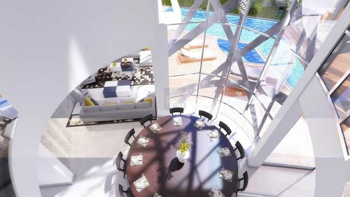 Moving to the ground floor, a world of sophistication unfolds seamlessly, blending an open-plan kitchen, a spacious dining area, and a welcoming living room. A guest WC adds to the convenience, while the outdoor deck, gracefully positioned alongside the alluring pool and jacuzzi, extends a warm invitation to bask in the sun's embrace. The lounge area is the perfect setting for savoring refreshing cocktails while soaking in the majestic view of the turquoise sea waters.