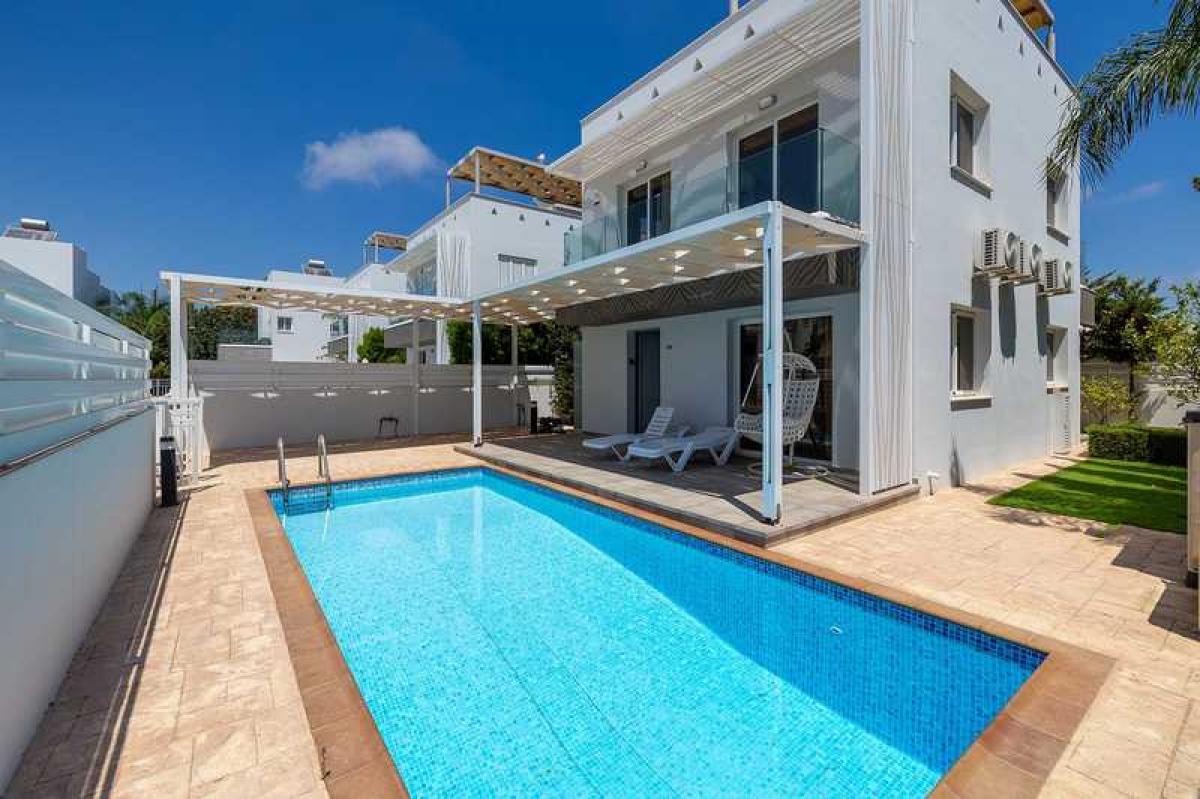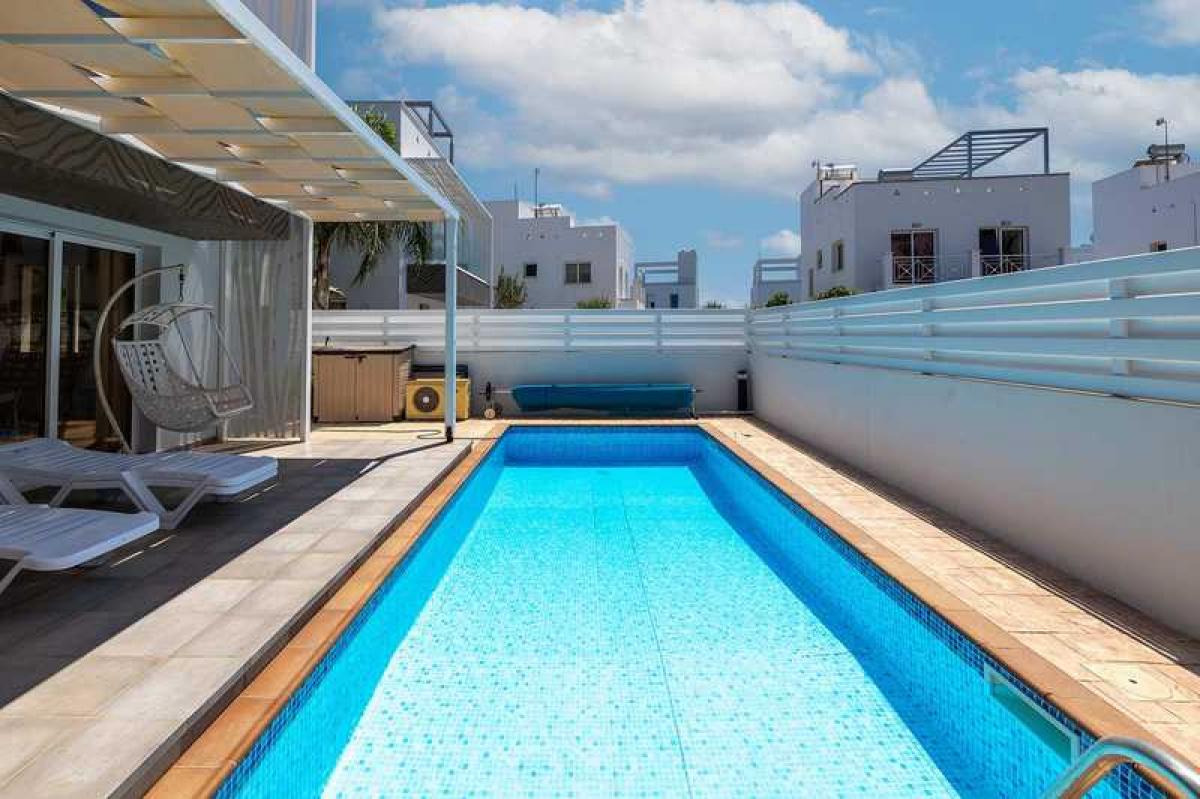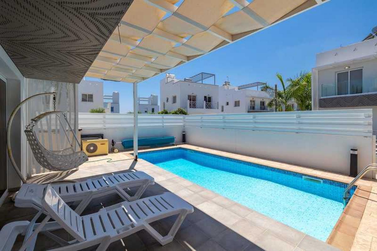 This elegant, modern, fully furnished villa is located in a quiet residential complex in the sought-after tourist destination of Ayia Napa, just a few minutes' drive from the town center and some of Cyprus's finest beaches. You'll find everything you need within walking distance - stunning sandy beaches, water sports, shops and restaurants, banks, pharmacies, as well as attractions and plenty of entertainment options.The villa's design maximizes the potential of its location and orientation, providing a functional living space with high-quality interior and exterior finishes that perfectly blend aesthetics and practicality. Equipped with electrical heating and new air conditioning units, the home ensures year-round comfort.