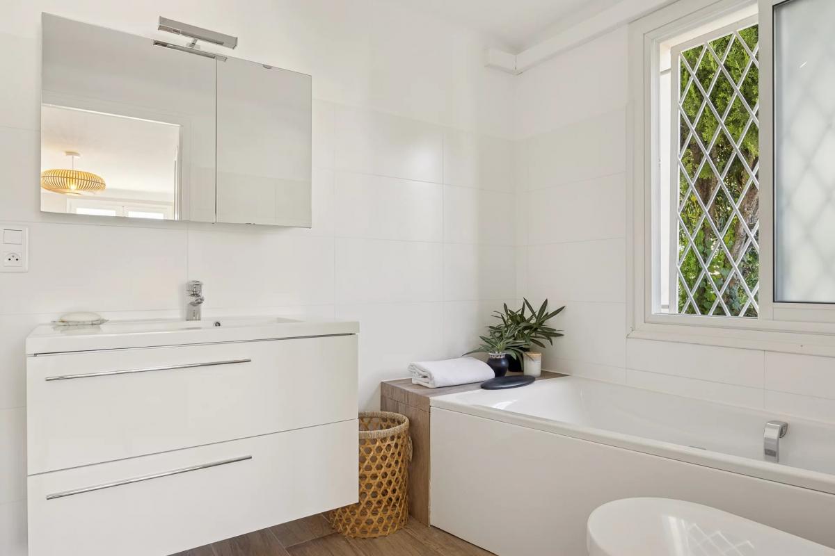 The villa offers generous volumes and exceptional brightness. The ground floor features a spacious entrance hall leading to three en-suite bedrooms, a laundry room, and a shower room with toilet, ideal after a swim. Upstairs, a large living room with fireplace opens onto a sunny terrace with a partial sea view, alongside a fully equipped kitchen and two additional bedrooms.