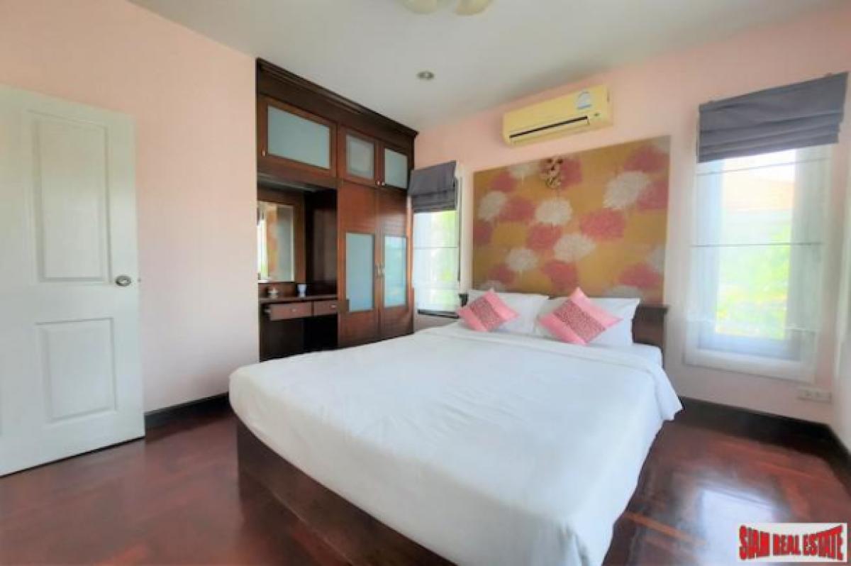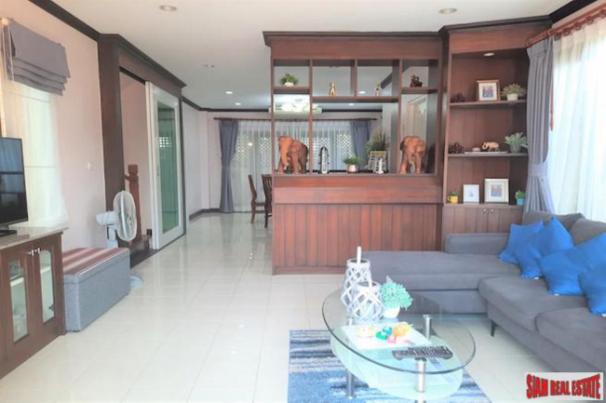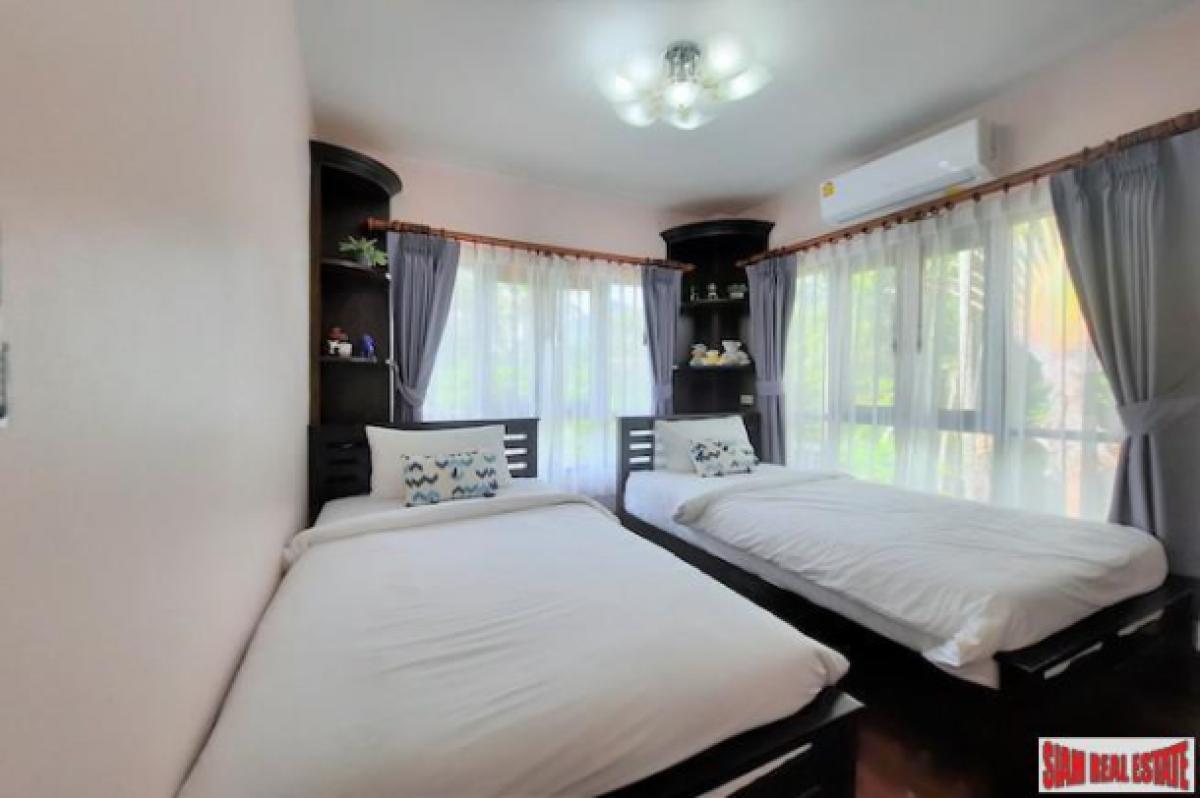 A nice two-story detached house for sale located in a village estate with good security system. The land is 408 sqm with a private swimming pool and gardens. On the ground floor of the newly renovated house there is parking for two cars, living room, kitchen, dining room and bathroom. In addition there is a new laundry room. There is a big round dining table that seats six and the flooring is clean white tiles on this level.On the first floor there are three bedrooms, all have built-in wood wardrobes, and one shared bathroom. The master bedroom has a big balcony for relaxing and enjoying the scenery. There are lots of windows in these rooms that allow fresh air and sunshine in. The house is beautifully decorated and there is wood flooring on this level.