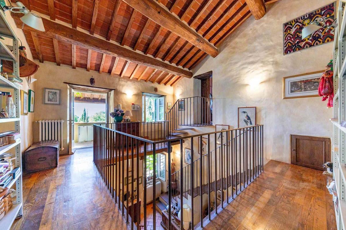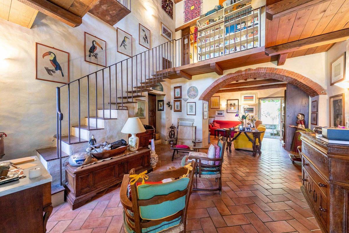 A charming avenue of tall cypress trees leads to the main entrance of the farmhouse, creating a welcoming and elegant approach. The large central hall on the ground floor is divided into two distinctive areas: the first features a double-height ceiling with a mezzanine balcony leading to the bedrooms upstairs, while the second offers a cozy atmosphere centered around a grand stone fireplace.