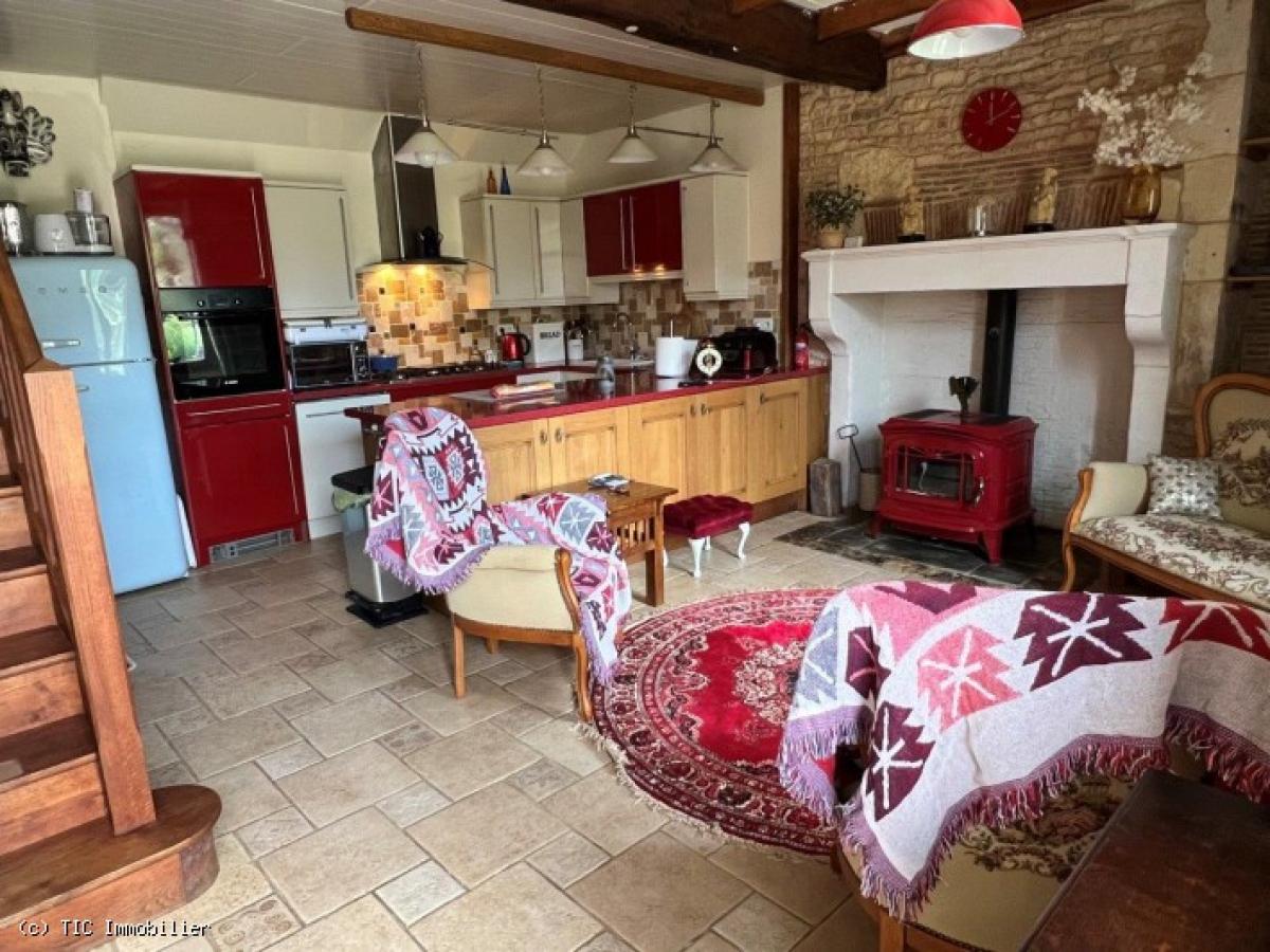 - Fitted kitchen (29m2): tiled floor, wood stove, exposed stone and beams