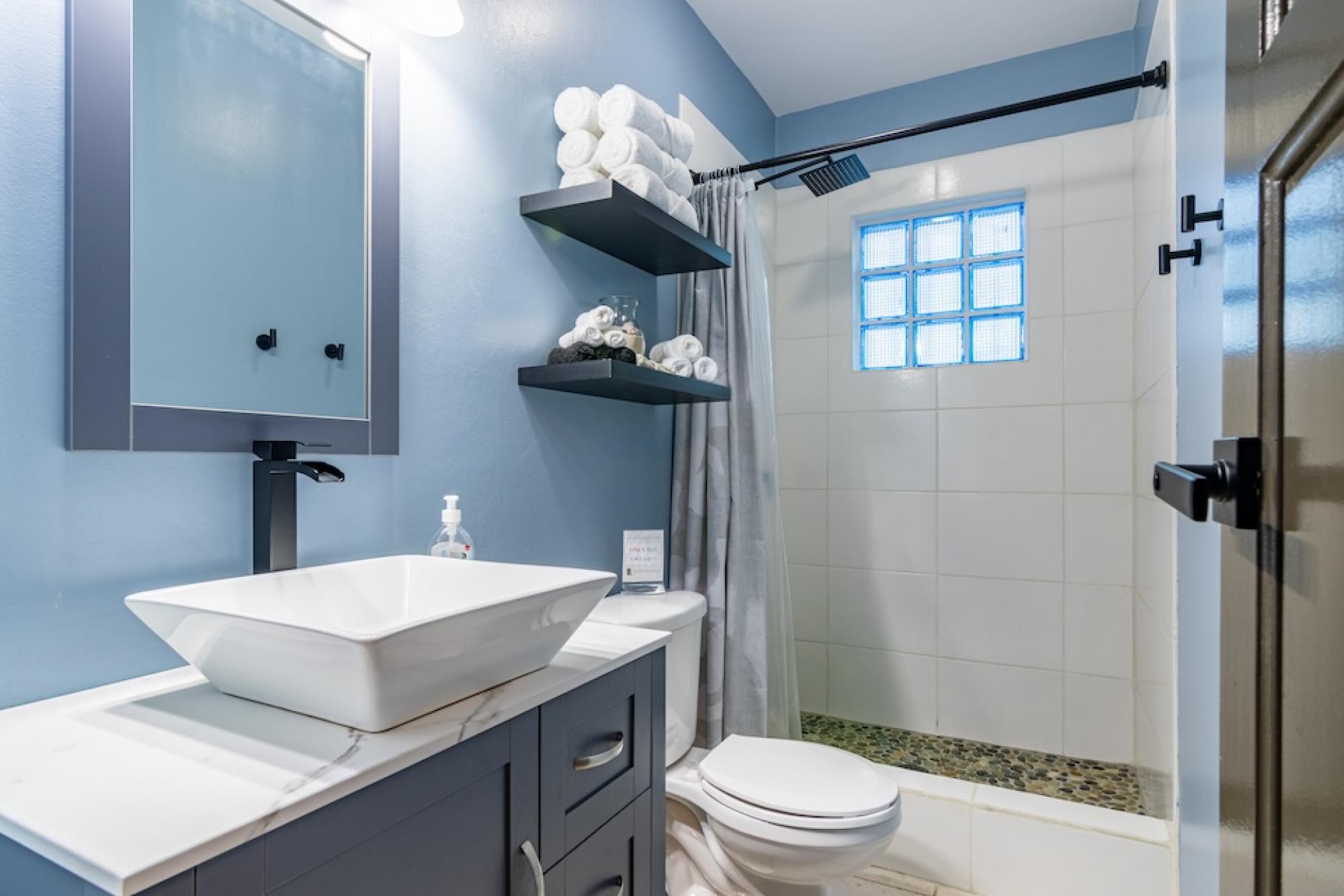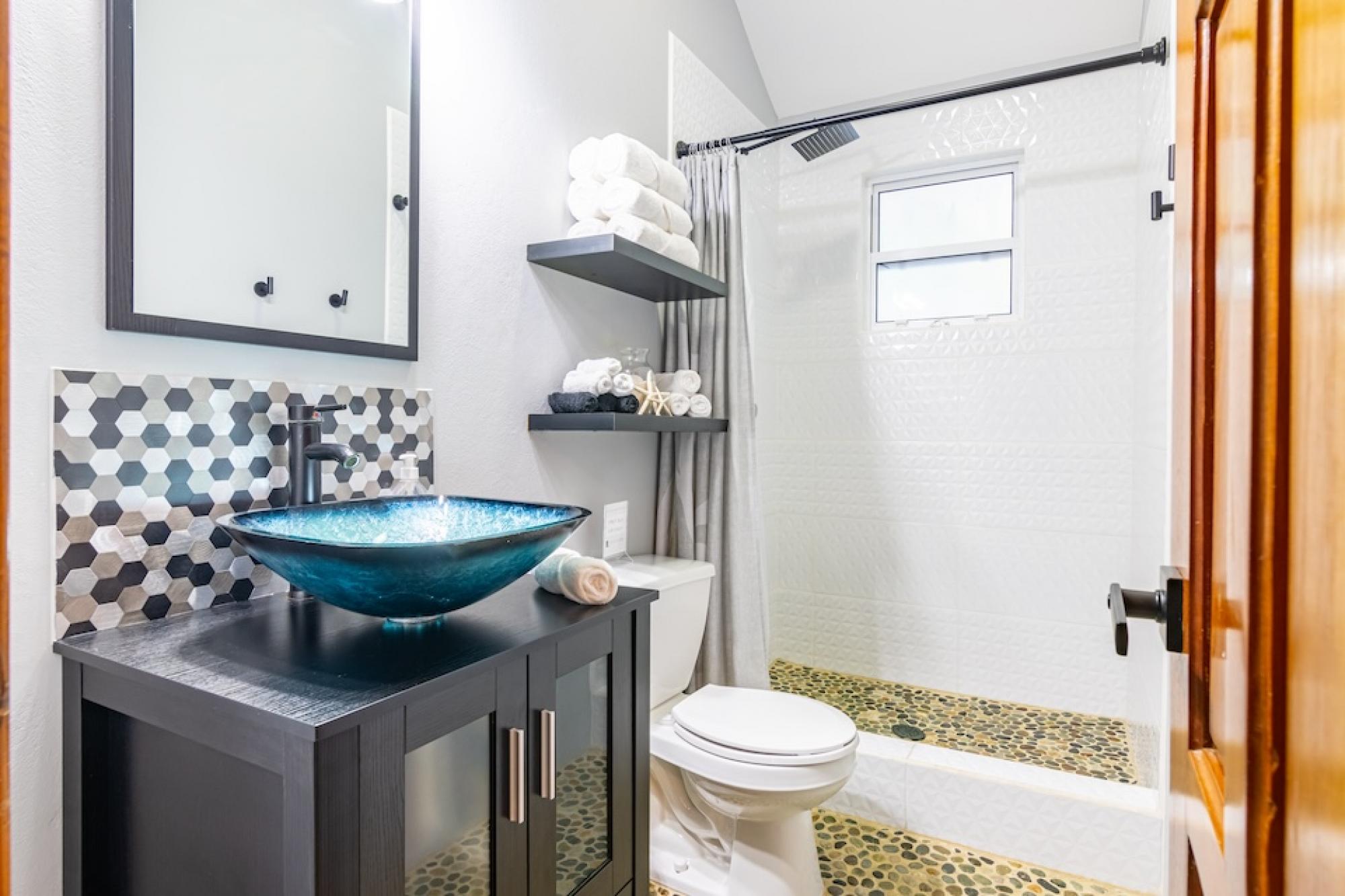 But the real beauty of Azul Vista Villas can be found in the carefully designed tropical oasis that welcomes you outside. A salt water pool in the middle of the deck beckons you to grab a lounger, soak in the sun under an umbrella or relax on the sofa seating under a cabana. A private courtyard with a palapa and bar seating is a lovely spot to escape the sun's rays. And as the evening sets in, gather around the gas fire pit seating area with friends to share stories of the day's adventures or plan tomorrow's escapades. There's even a charcoal grill for the BBQ enthusiasts and a corn hole game for some added fun and friendly competition.