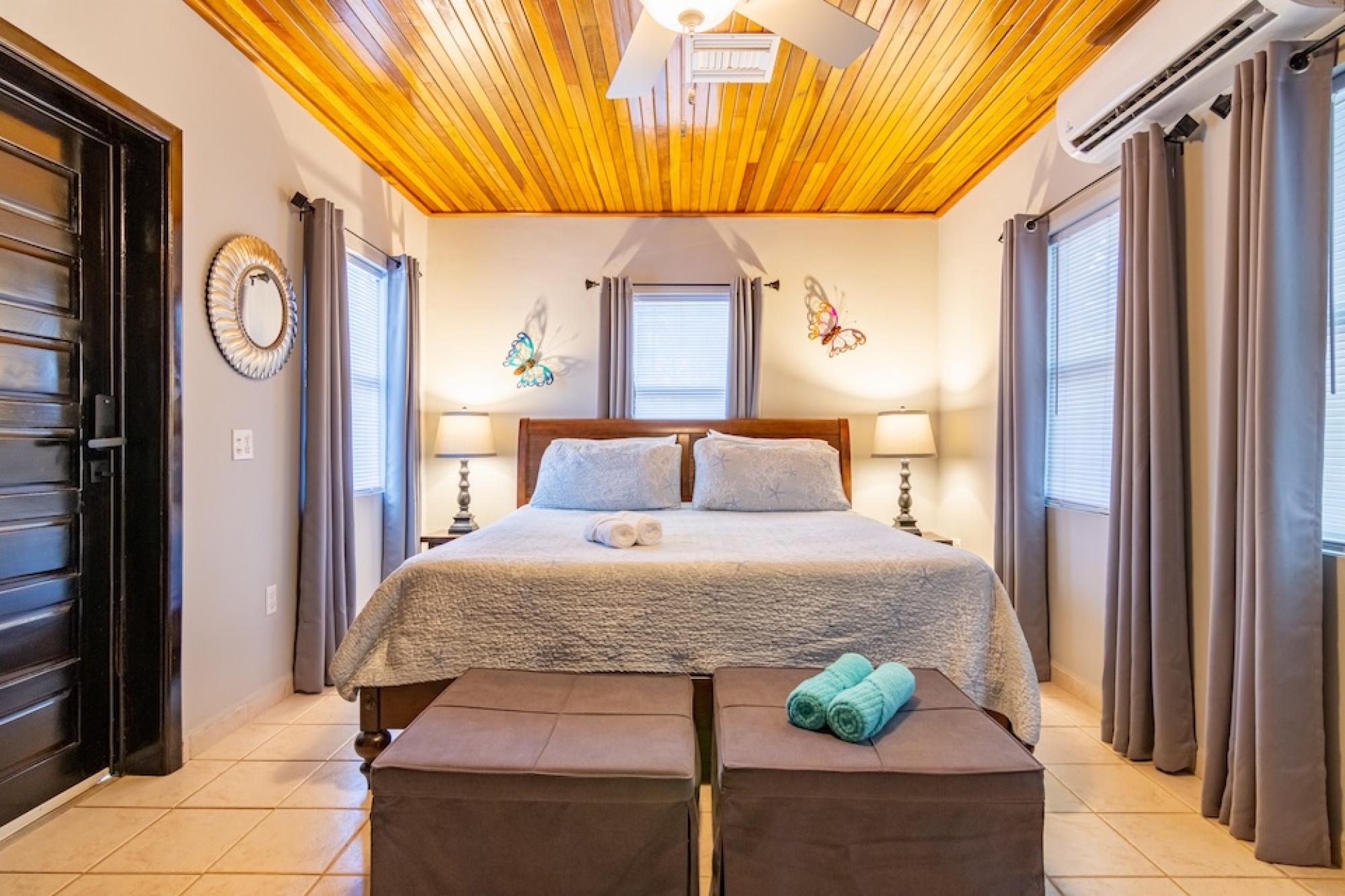 The property includes three vacation rental villas, with accommodations for up to 14 people. Villa Grande boasts a king bedroom with ensuite, a queen bedroom, a twin bunk bedroom, a living space with a sofa bed, a full bath and a full kitchen. Villa Medio offers a double bedroom, a twin bunk bedroom, a living space with a sofa bed, a full bath and a full kitchen. And Villa Pequena is a cozy studio-style villa with a double bed, full bath and kitchen.