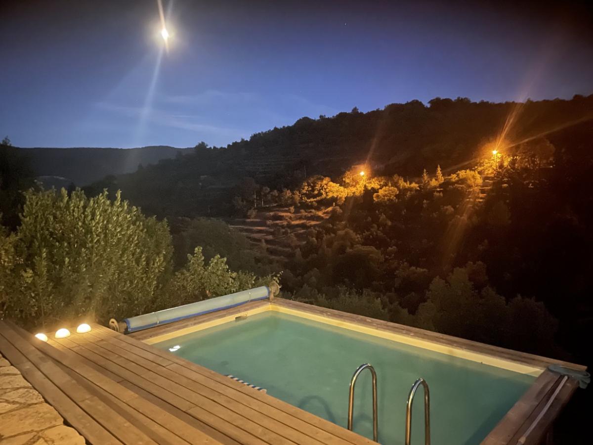 Outside = Large terraced plot of 2540 m2 with access to a small stream (water in winter only) + above-ground swimming pool (5x3m, chlorine) + parking space (2/3 cars) + no access for motorhomes due to narrow street + garden shed.
