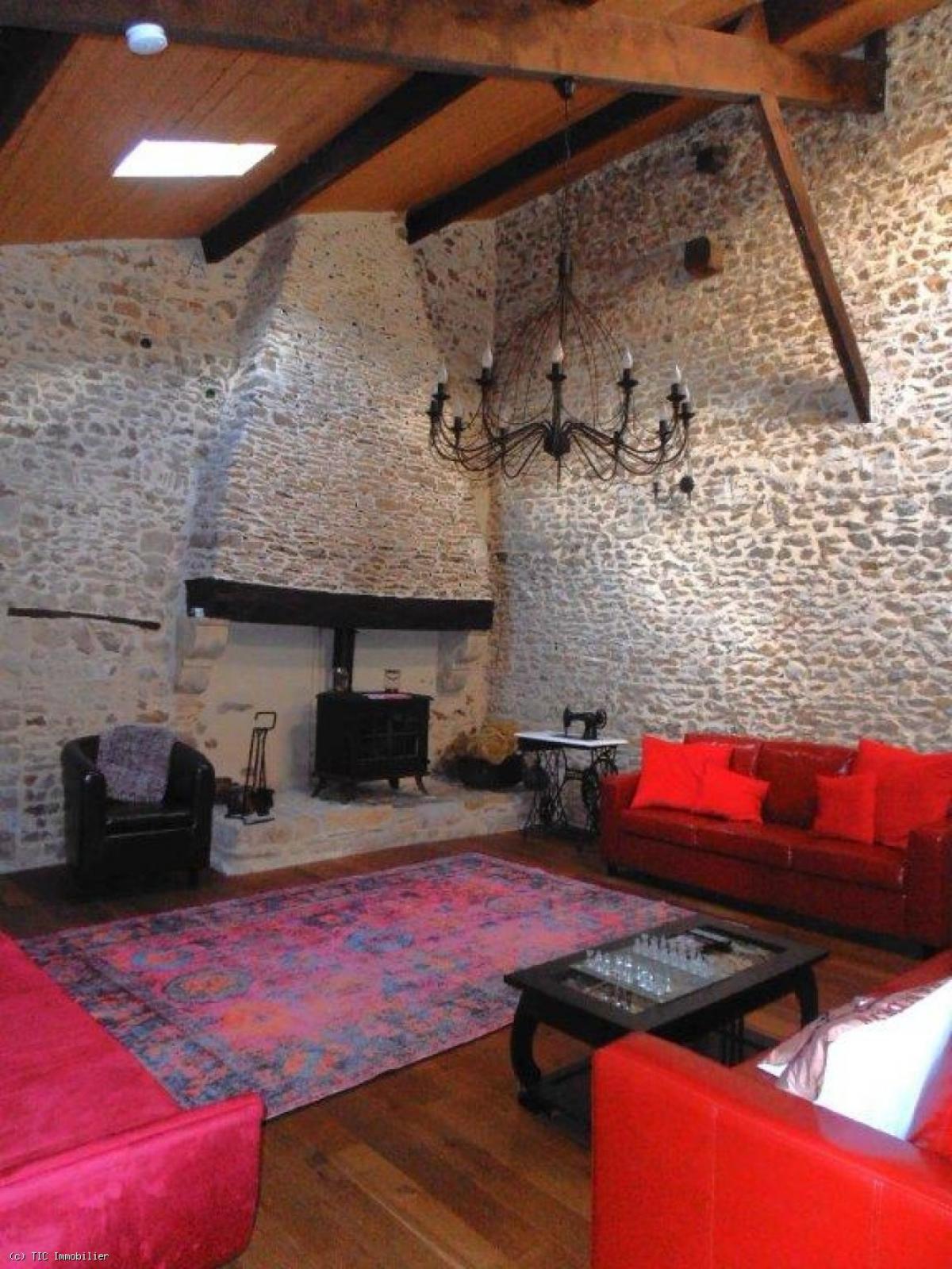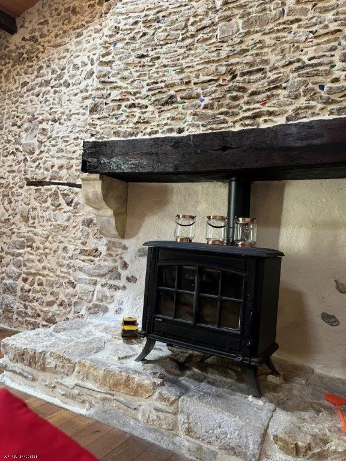 Fitted kitchen/dining-room (36m2). Tiled floor. Fireplace with wood burner, beams and exposed stone walls.