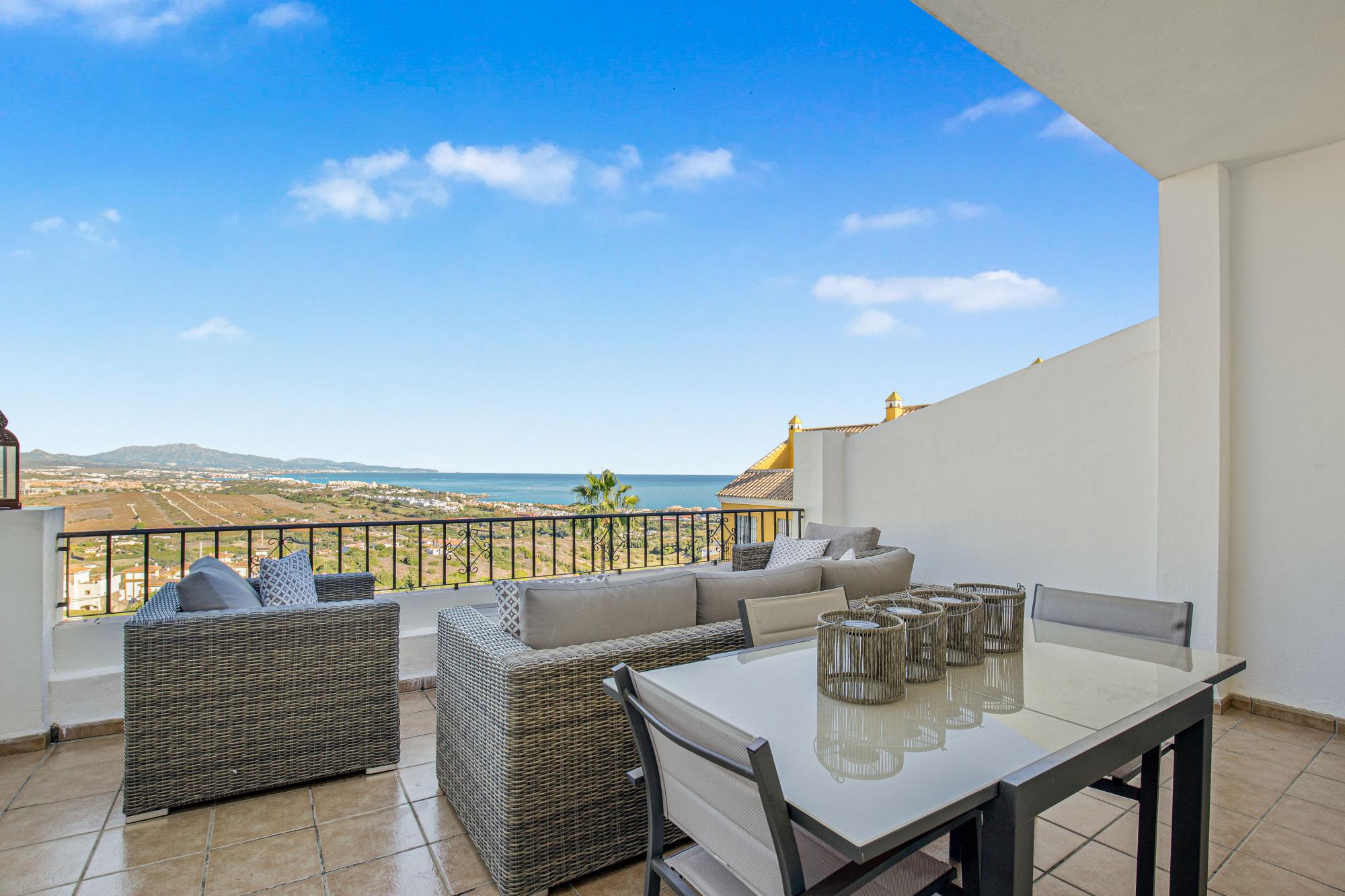 Off the main lounge, a large semi-covered balcony acts as an outdoor room in its own right, with views over vineyards, the communal pool, mountains and the coastline sweeping towards Estepona.