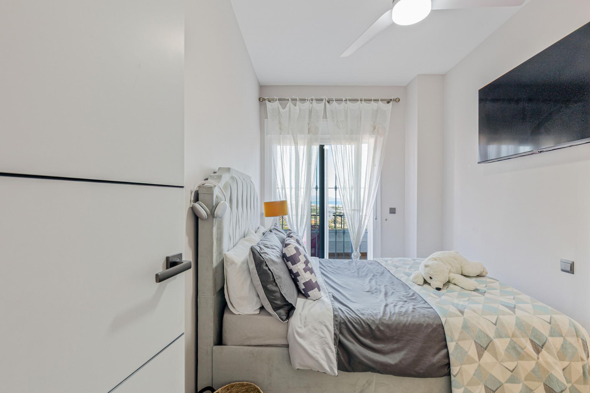 The lounge is bright and inviting, framed by views that steal your attention the moment you enter. Slide open the doors to a large semi-covered balcony and the landscape unfurls: vineyards and the communal pool in the foreground, mountains rising behind, and a coastline that sweeps towards Estepona. It’s a true outdoor room - somewhere to start the day with coffee and end it with sunset dinners - sheltered enough for year-round use yet open to the vistas that define the property.