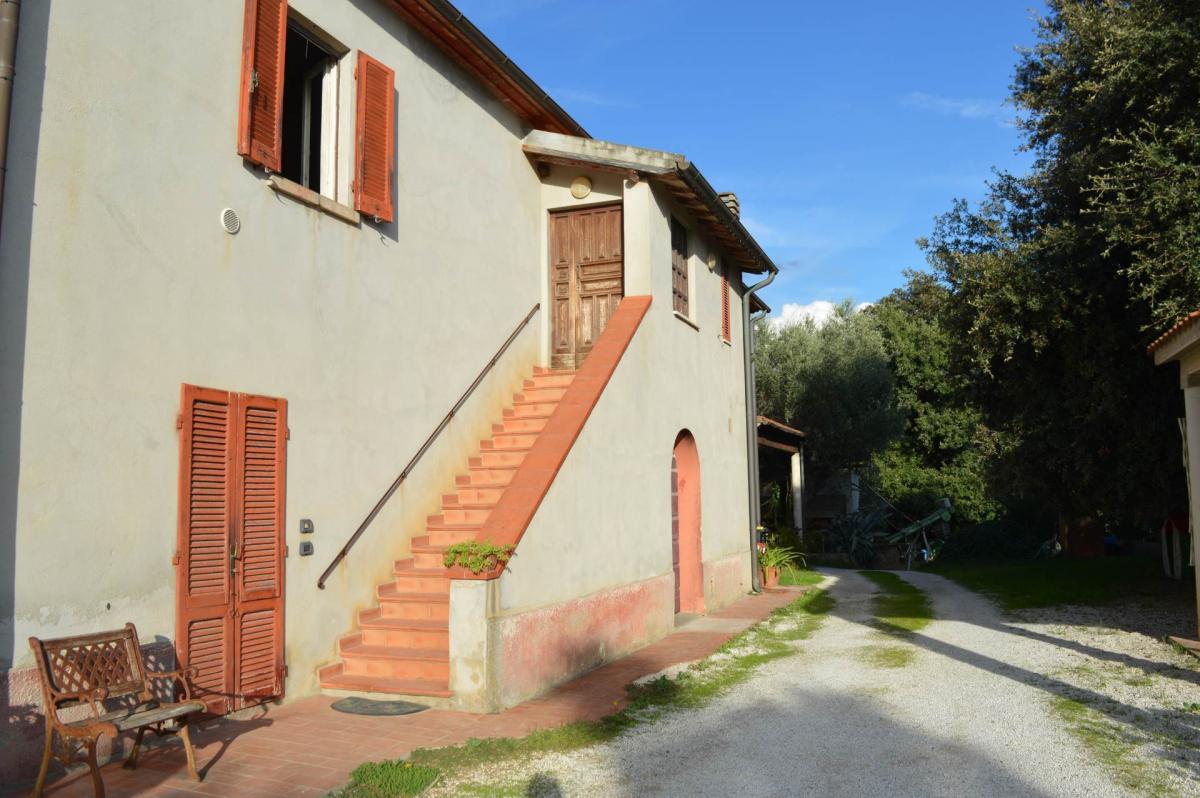 The main building, extending over two levels for a total of about 650 sqm, preserves the traditional charm of Tuscan rural architecture, with terracotta floors, wooden beams, and panoramic terraces that open onto the surrounding olive groves and vineyards.