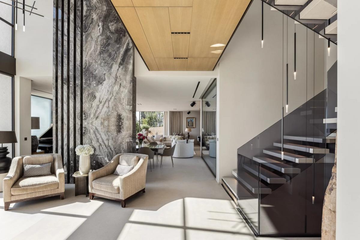 Outside, the villa opens onto a magnificent landscaped Mediterranean garden, creating a lush, soothing setting.
