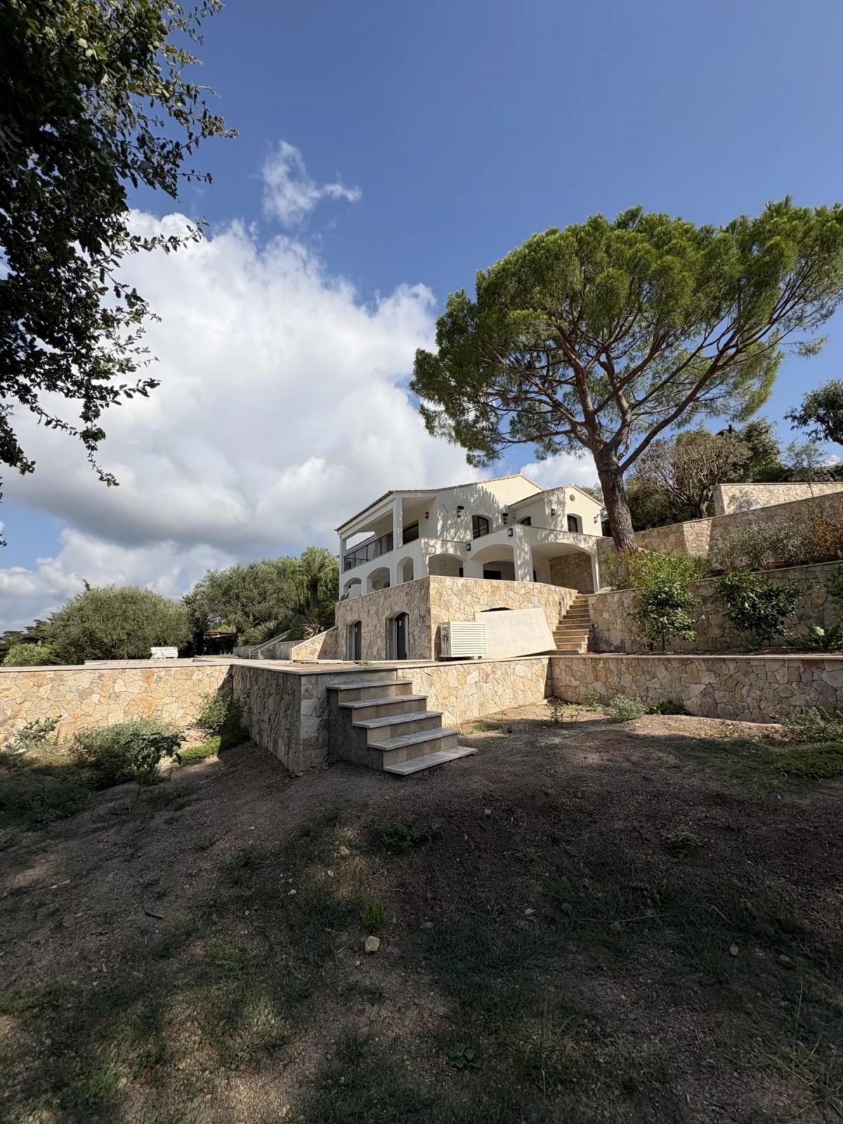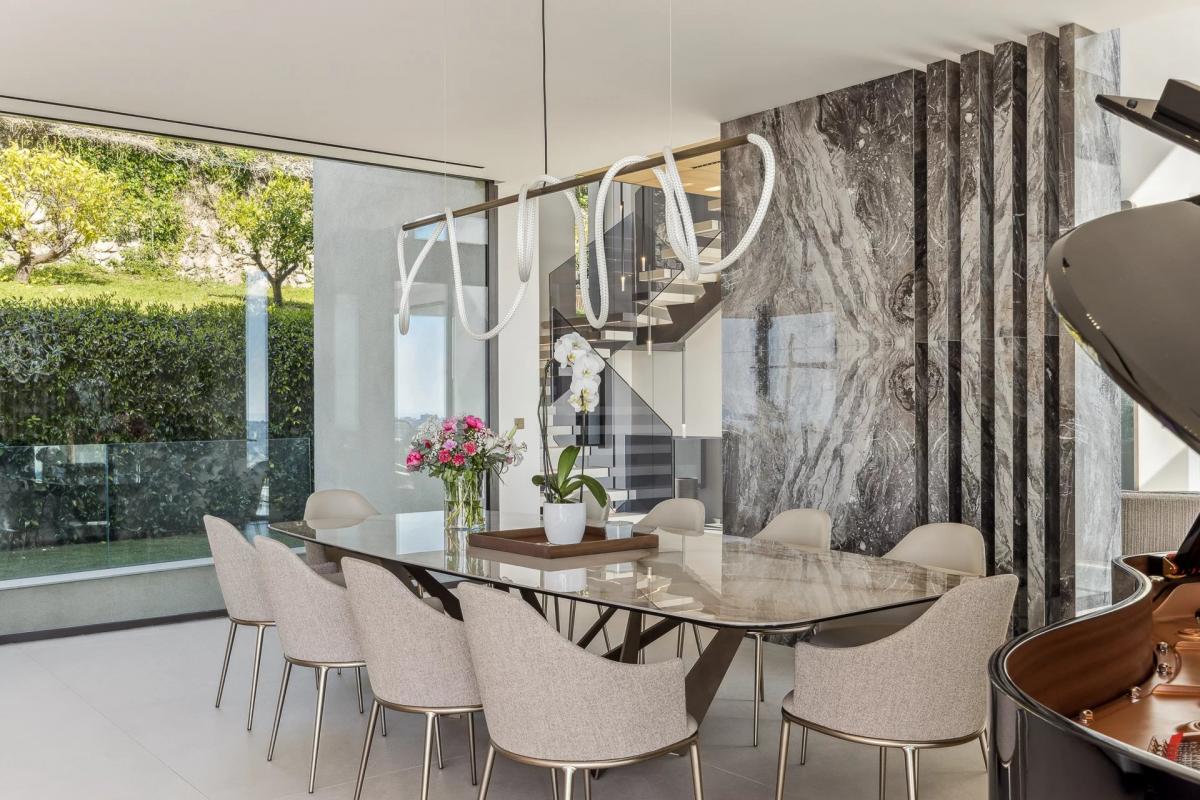 The villa features a vast living room, dining room, fully-equipped bespoke kitchen and 5 suites, including a master suite with private terrace and sea view.