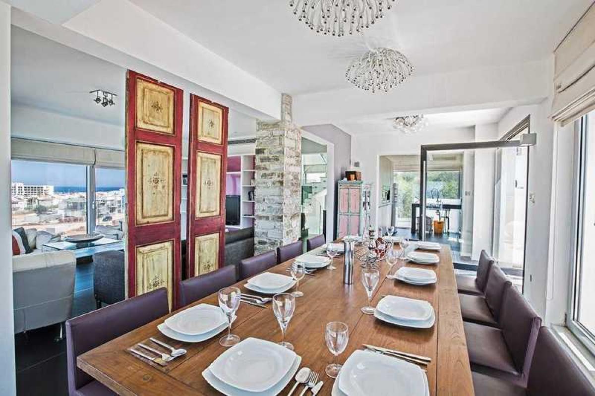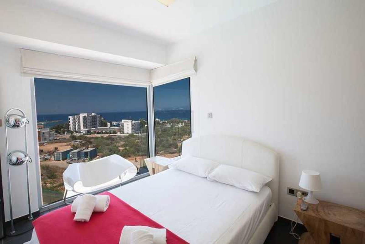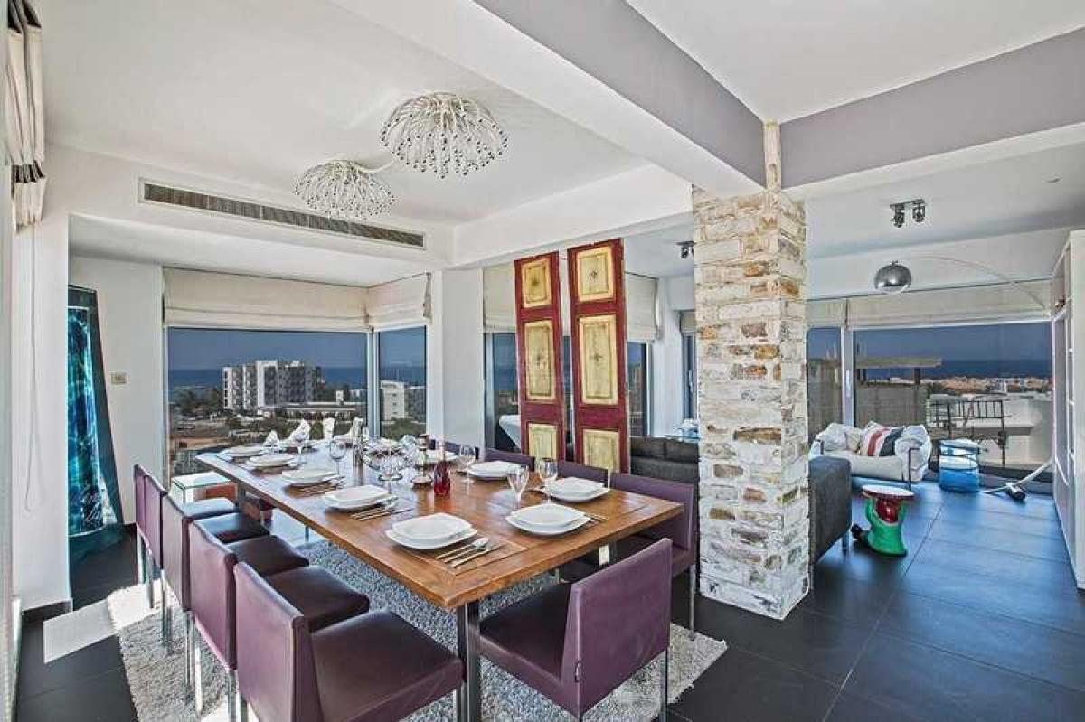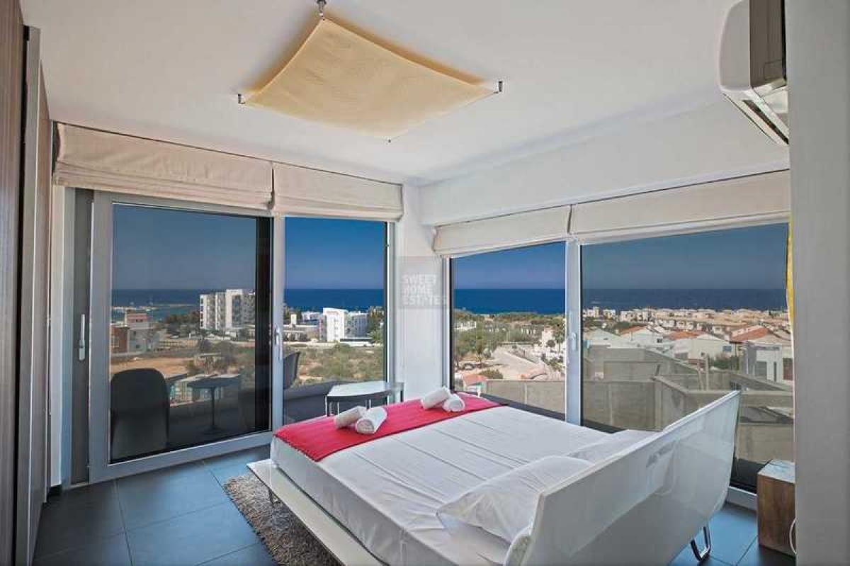 This exclusive villais located on a hill between Protaras and Ayia Napa overlooking the sparkling blue Mediterranean Sea. The main building of the villa has 4 bedrooms and an extra room which could be used as an additional bedroom with sofa-bed or as a study. It also has two main bathrooms including toilets, an unsuited shower and toilet in the master bedroom, and a quest toilet. The apartment attached to the villa has one bedroom, one bathroom with toilet and a large living room with a sofa bed that could be easily used as a bedroom. The villa is split on three floors. Three bedrooms are on the top level, one of them has an on-suite shower and the main bathroom has a bathtub. The middle level is an open plan design with the main living room, a dining area where you could seat 12 people and a very modern kitchen . The pool level has one double bedroom, a bathroom with bathtub, and an additional room bedroom/study and a large second living room with a glass dining table for 10. Also on this level is the two rooms attached apartment with pool view. The villa is fully air-conditioned with a central system and it is also central heated with floor heating system.Reference number: 1930
