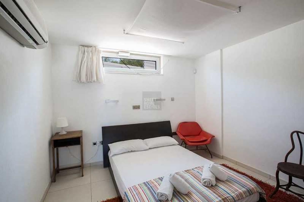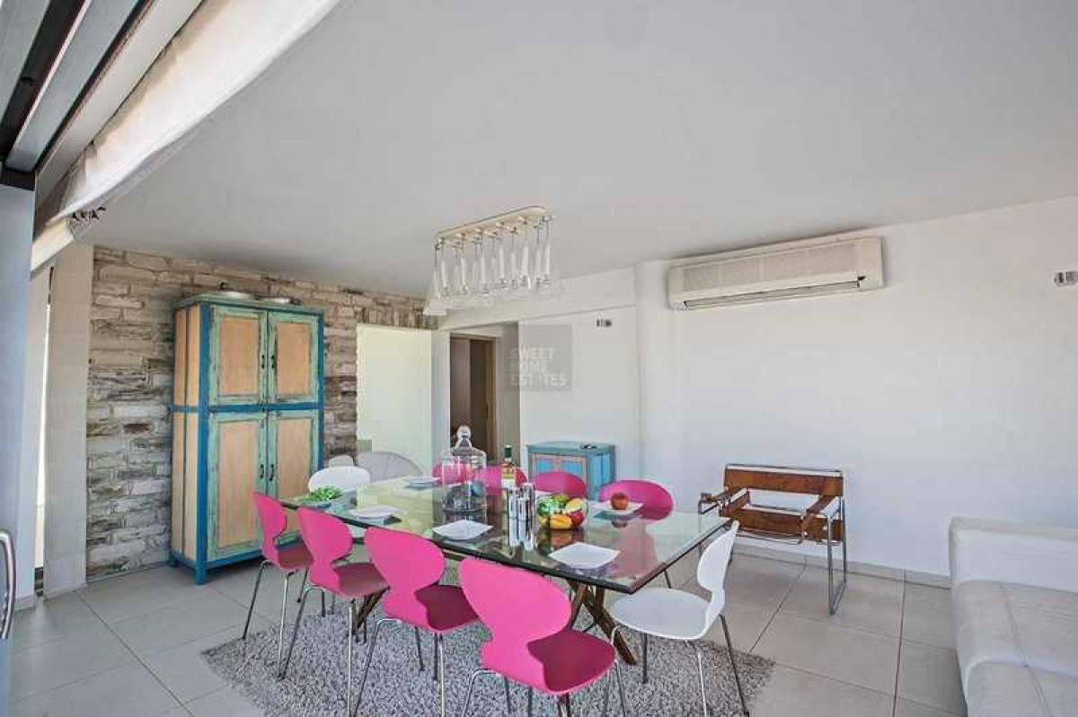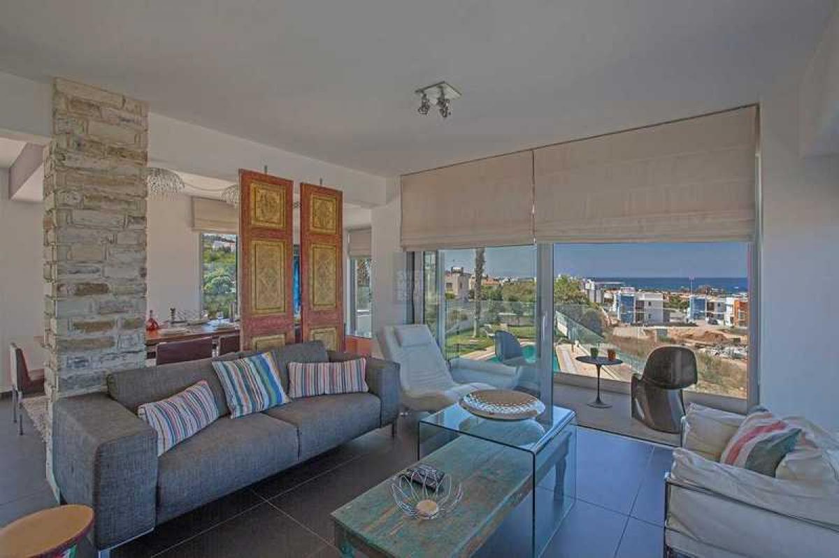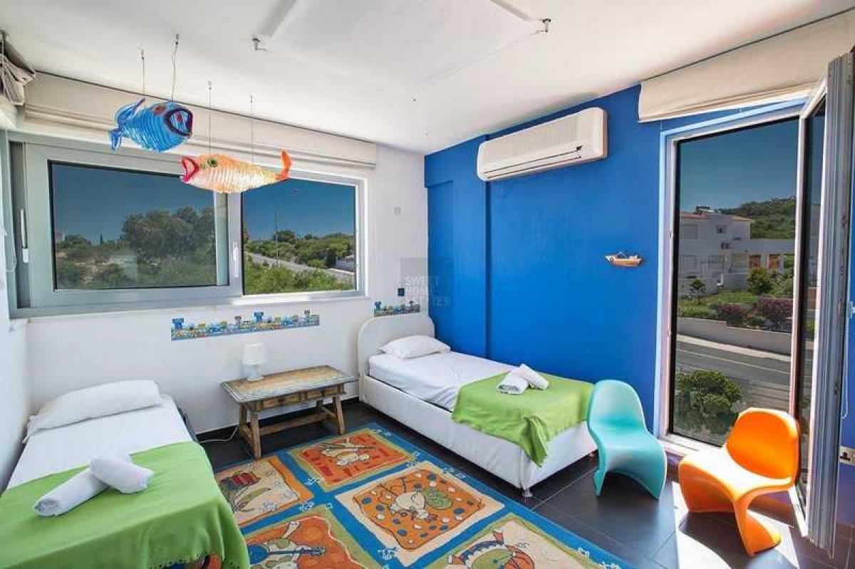 This exclusive villais located on a hill between Protaras and Ayia Napa overlooking the sparkling blue Mediterranean Sea. The main building of the villa has 4 bedrooms and an extra room which could be used as an additional bedroom with sofa-bed or as a study. It also has two main bathrooms including toilets, an unsuited shower and toilet in the master bedroom, and a quest toilet. The apartment attached to the villa has one bedroom, one bathroom with toilet and a large living room with a sofa bed that could be easily used as a bedroom. The villa is split on three floors. Three bedrooms are on the top level, one of them has an on-suite shower and the main bathroom has a bathtub. The middle level is an open plan design with the main living room, a dining area where you could seat 12 people and a very modern kitchen . The pool level has one double bedroom, a bathroom with bathtub, and an additional room bedroom/study and a large second living room with a glass dining table for 10. Also on this level is the two rooms attached apartment with pool view. The villa is fully air-conditioned with a central system and it is also central heated with floor heating system.Reference number: 1930
