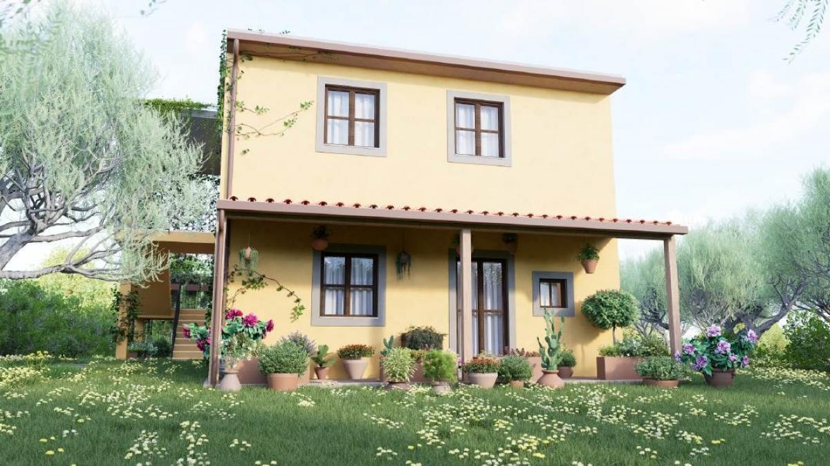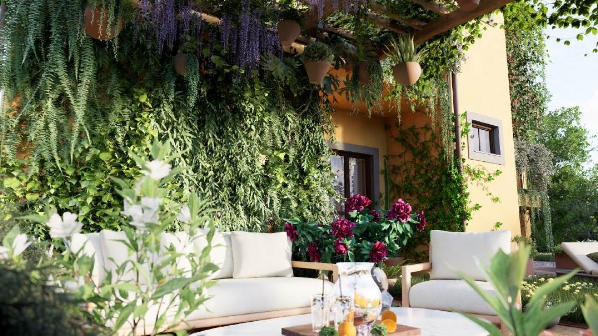 The first floor, accessed via a covered external staircase, mirrors the layout of the ground floor and includes two panoramic terraces offering lovely views over the surrounding greenery.