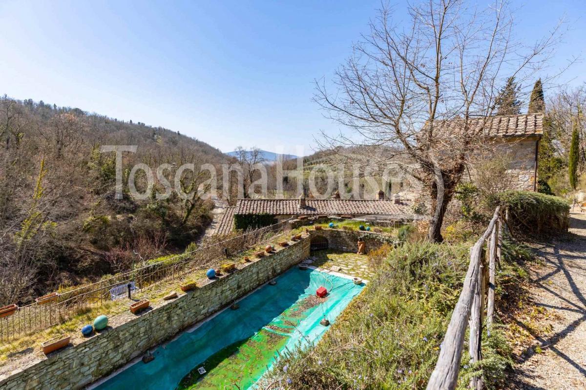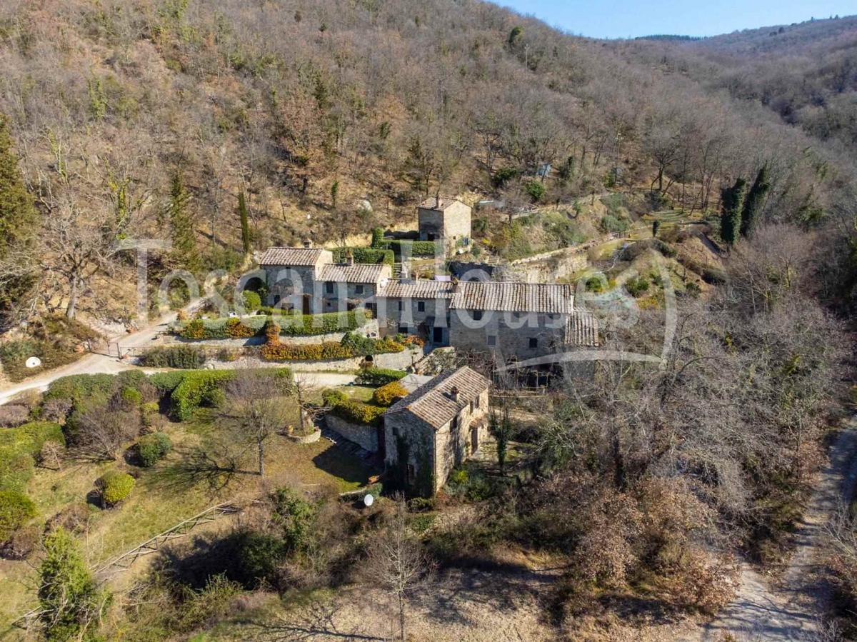 The dominant panoramic position offers breathtaking views of the surrounding green hills, while a stream runs through the property, creating a unique and enchanting atmosphere. The estate spans 9 hectares of land, featuring a terraced garden, a swimming pool with solarium, and an ancient mill.