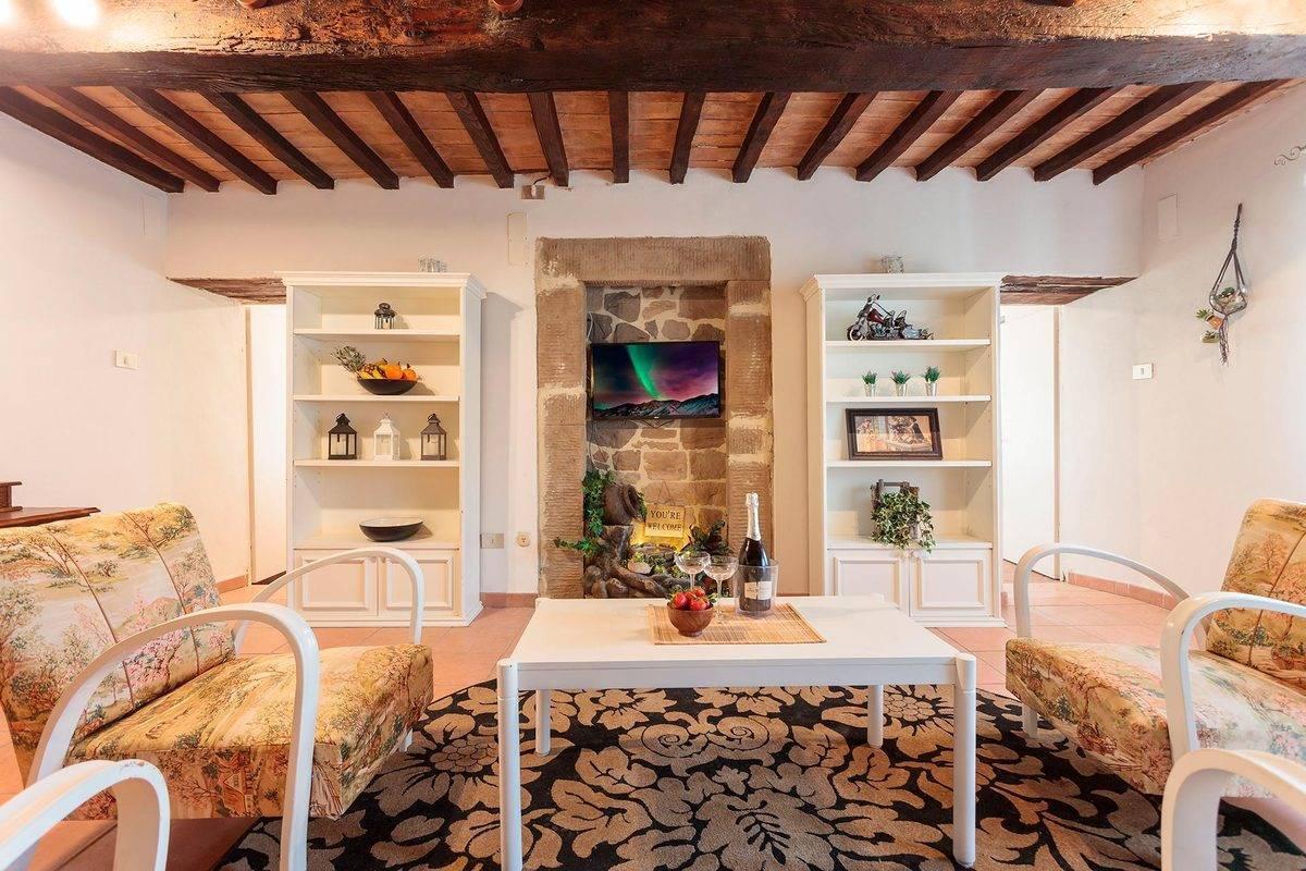 The outdoor spaces are designed for enjoying the beauty of the Tuscan countryside. The farmhouse is surrounded by a large furnished garden, featuring a lounge area, outdoor jacuzzi, sunbeds, and shower, as well as a patio with barbecue and dining area, perfect for al fresco meals.
