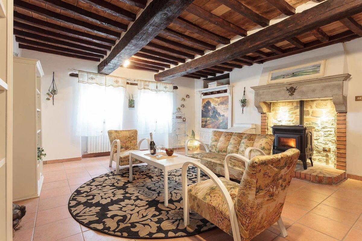 The upper level hosts the sleeping area, with three bedrooms, a bathroom, and a cozy sitting room with pellet stove. The lower floor features a spacious eat-in kitchen with fireplace, fully equipped and designed as the heart of the home. interiors are bright and spacious, enhanced by traditional materials such as wood and stone, creating a warm and authentic atmosphere.