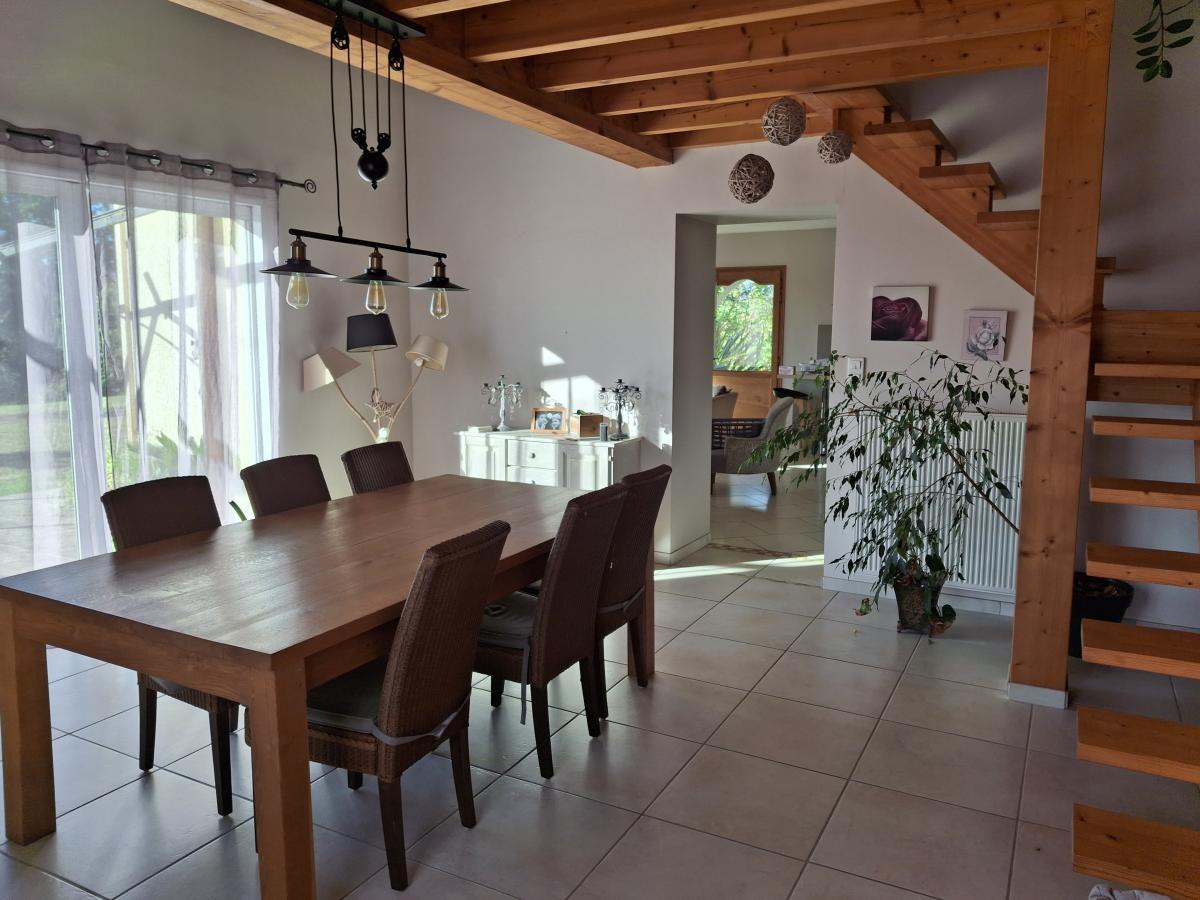 Nestled in a quiet rural plot of over 3 acres, not overlooked by any neighbours, this house built in 2004, extended in 2014, offers a bright and comfortable interior. It is composed of a beautiful fully equipped kitchen opening to the living room, a dining room, a corridor giving access to the boiler room, a shower room, a toilet and 3 bedrooms with built-in wardrobes & an upstairs mezzanine bedroom.Large garage / summer kitchen about 50m2 & 18m2 garden shed.