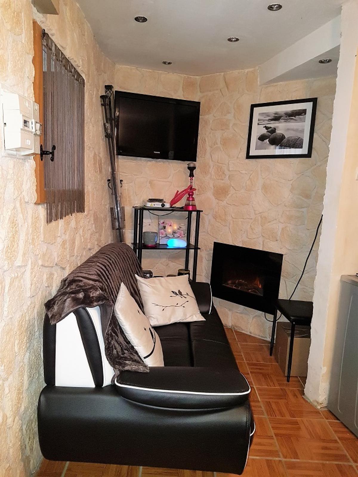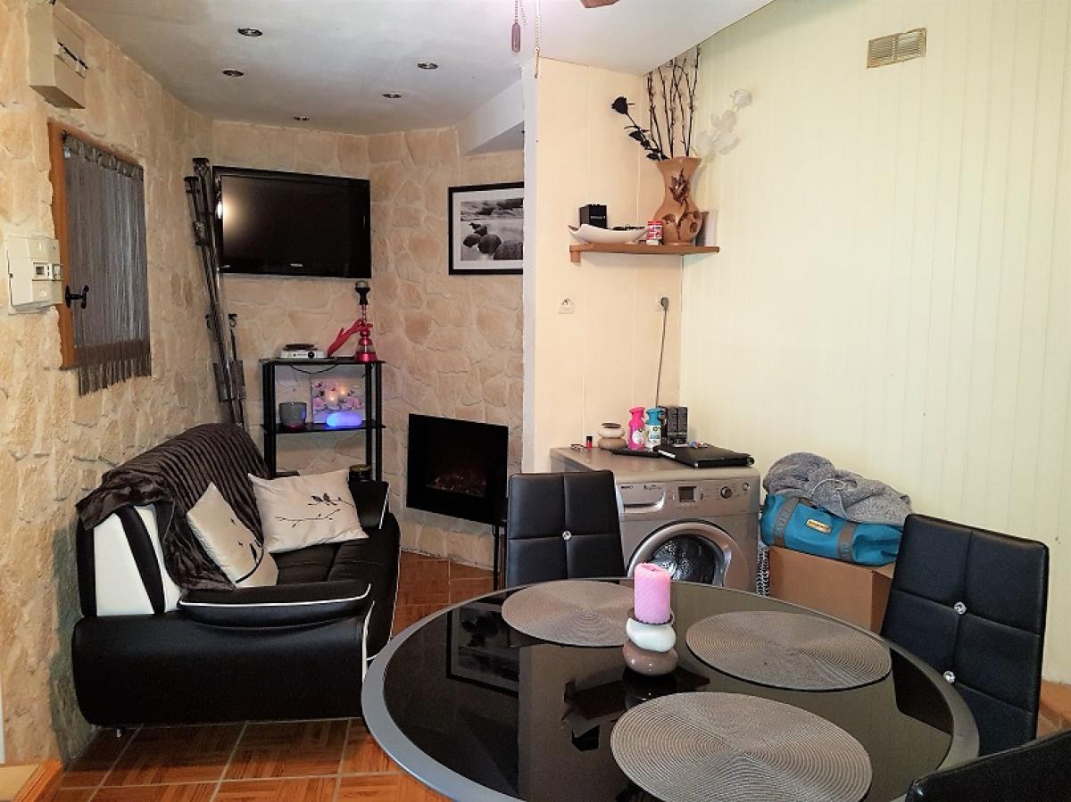 Ground = Cosy living area with open kitchen of about 18 m2 (gas hob, lower and higher units) with stone walls, main door with roller shutter, tiled floor (wooden imitation) and electric heaters.