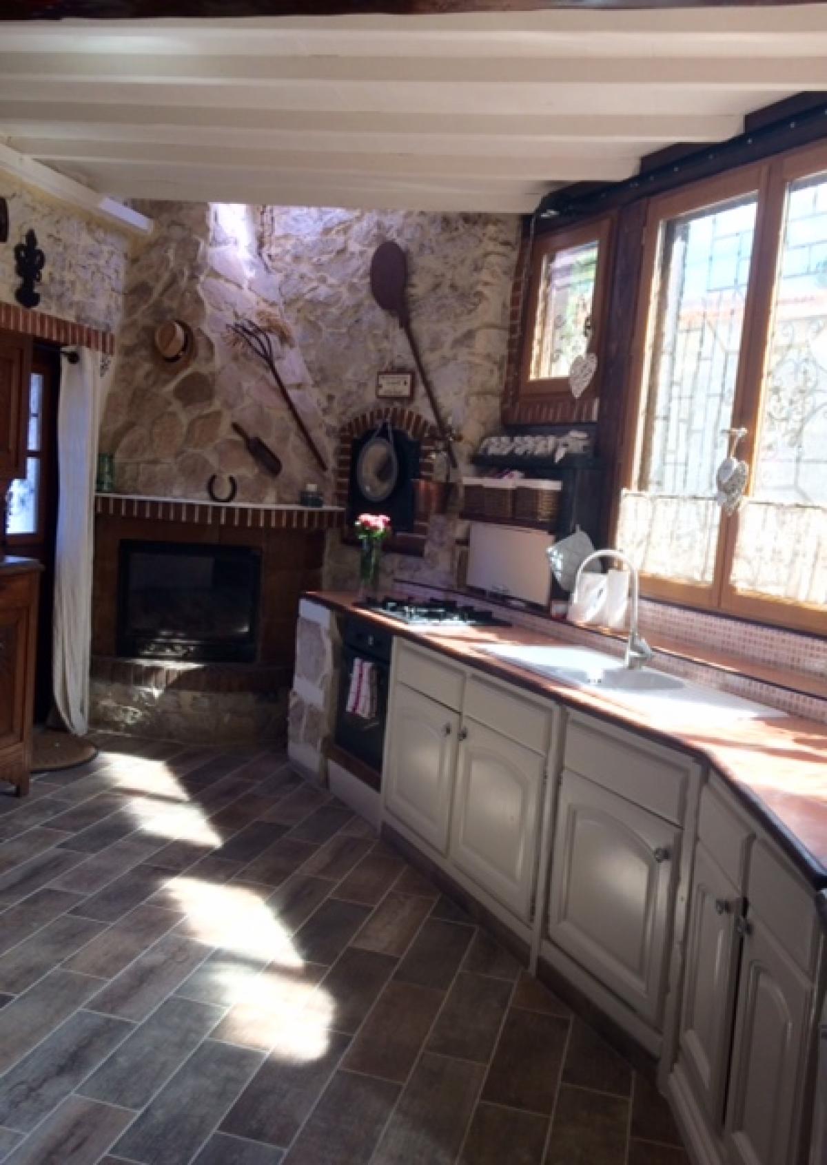 Ground = Traditional kitchen (oven, hob, fridge) and dining area of 24 m2 with a nice fireplace and opening onto the lounge area of 15 m2 + an office corner of 8 m2 with wooden integrated shelving and drawers + separate wc + a nice bathroom of 8 m2 (corner bath, sink, washing machine) + access from outside, a cellar of 6 m2 (below the terrace).