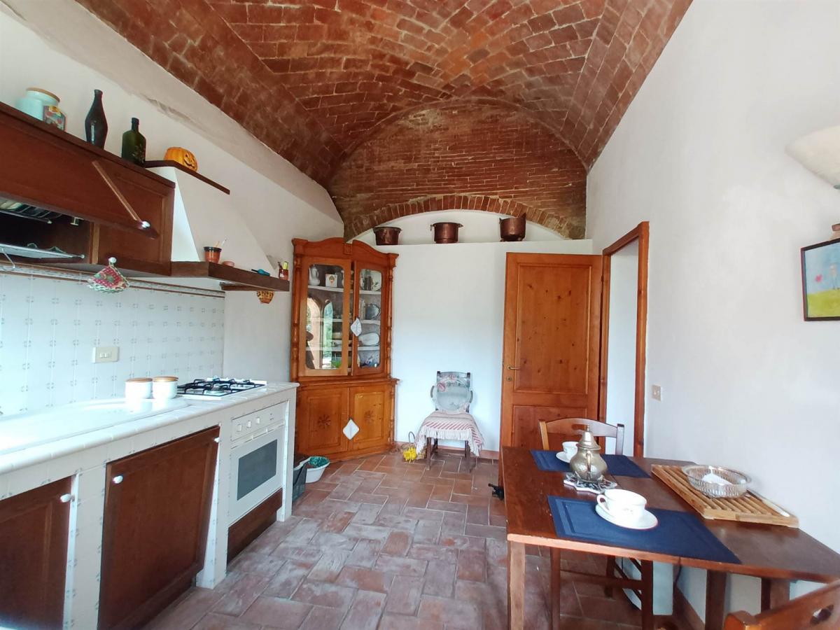The main floor features a cozy living room with a fireplace, two single-acting windows that provide picturesque views of the Monte Cetona countryside. The dining room has a French window leading directly to the garden, as does the masonry kitchen, which offers a spectacular view from the window above the work surface. The ceiling with antique brick vaults adds a touch of refinement. Also on this floor, there is a guest bathroom with a small bathtub and shower, with the same vaulted ceiling.