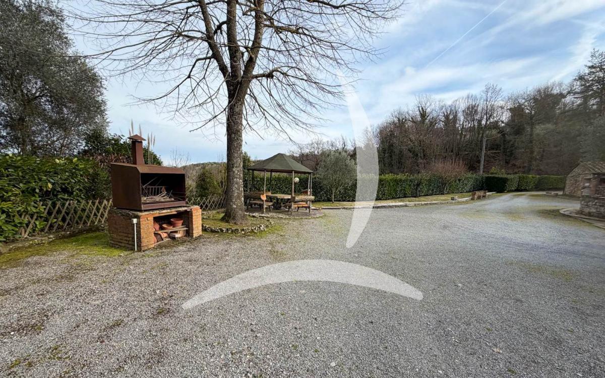The property is surrounded by a vast 6-hectare plot of land ensuring maximum privacy and diverse agricultural production, including an orchard, an olive grove, a small vineyard, arable land, and woods. The exclusive garden hosts century-old trees and offers breathtaking views over the Val di Chiana hills. A highly valuable element is the cellar carved into the tufa rock, ideal for storing wine and oil. The estate is completed by three agricultural annexes totaling 150 sqm, offering further development potential. While enjoying a secluded and quiet position, the farmhouse remains strategically close to all the services of the village of Cetona.