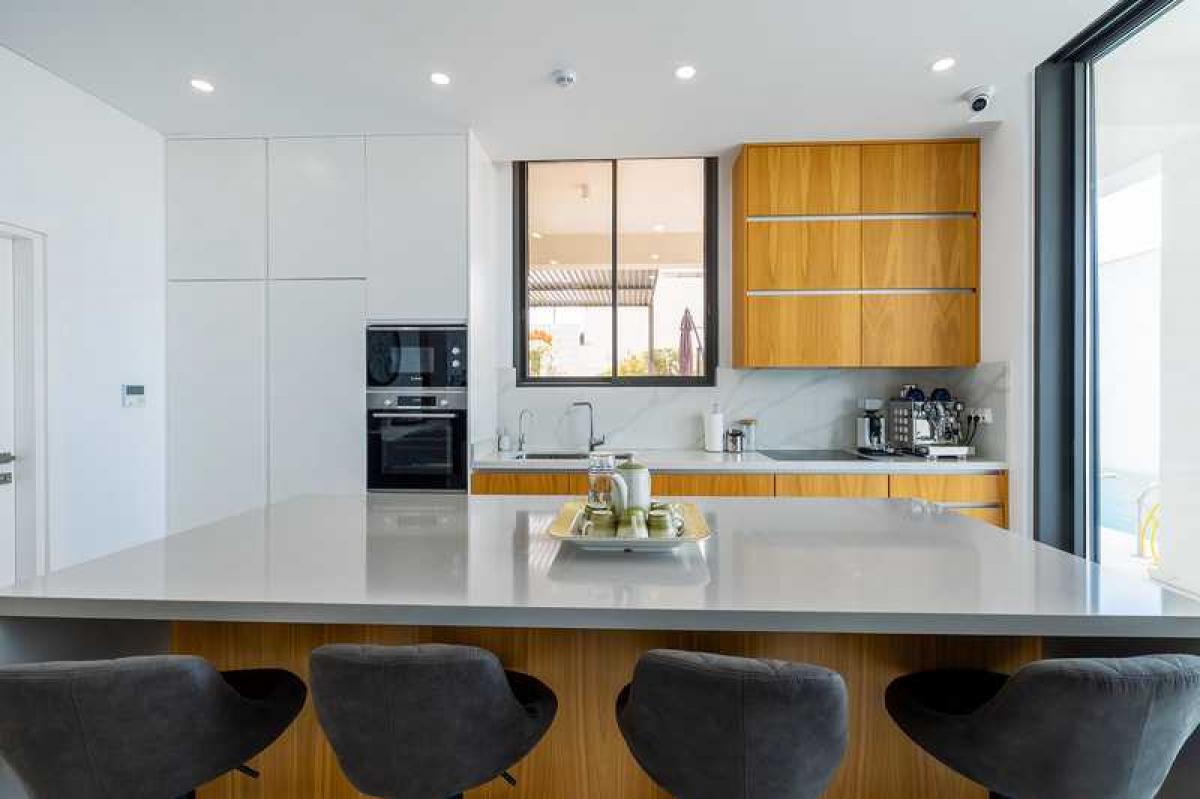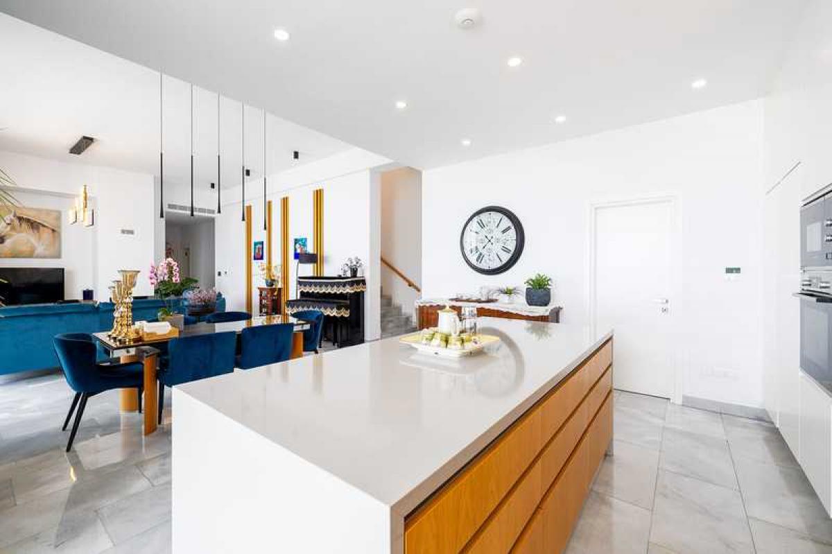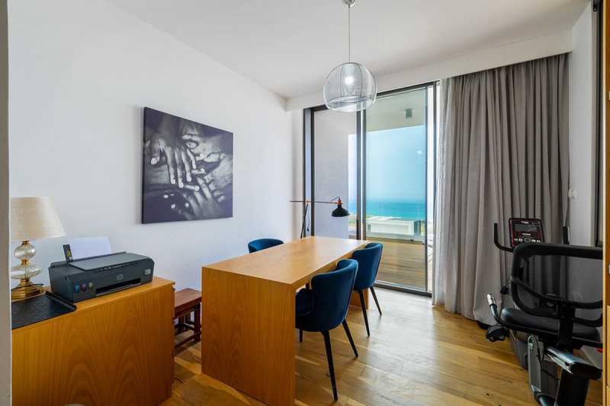 Step inside to find a luxurious interior layout. Large floor-to-ceiling windows flood the rooms with warm natural light and showcase stunning views of the Mediterranean Sea. The spacious interiors feature modern and elegant designer finishes, such as Italian tiles and laminated wood flooring, creating a sophisticated and refined atmosphere.