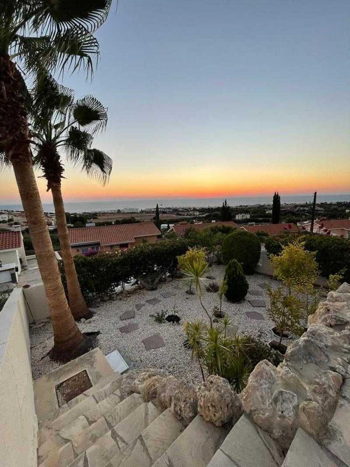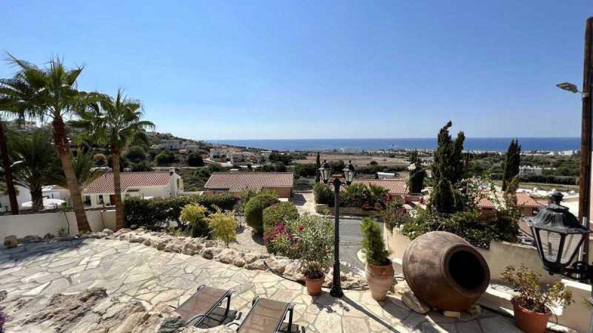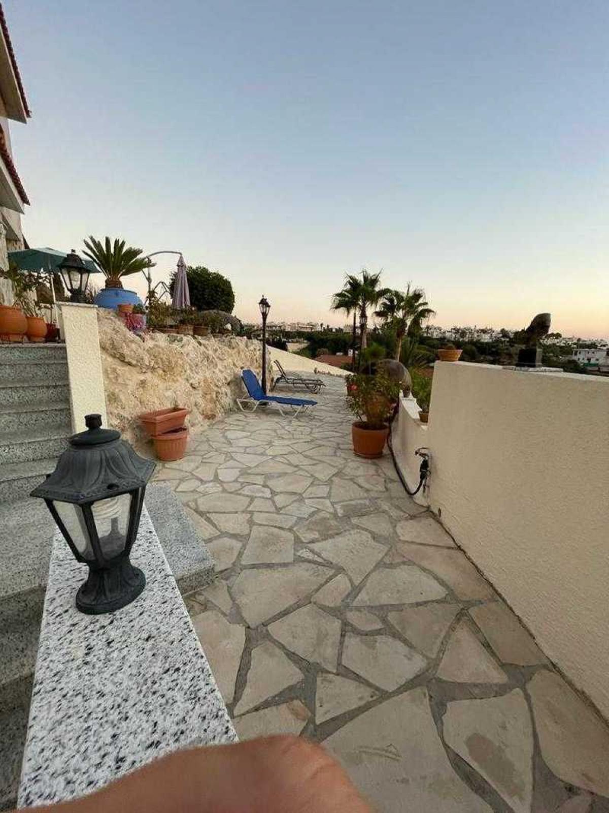 This villa is located just a few minutes drive from Paphos, the Aspire private English School, Lidl supermarket with panoramic views of the Mediterranean coast and a ship on the rocks. The villa is decorated with marble, which gives it a delightful look. It is located on a hill.The plot has 4 levels, on different levels with a well-maintained garden and enough space to accommodate an Infinity pool if necessary. The house has three floors. The layout of the first floor consists of a living room/recreation areas, open-plan kitchens with a beautifully decorated bar counter decorated with an illuminated onyx composition. There is also a guest toilet and a separate laundry/utility room on this level.