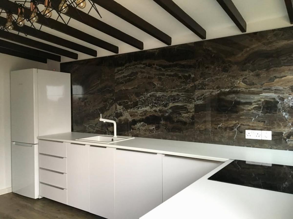The laconic light walls with a perfect smooth finishing and the open layout of the main living areas (the kitchen-dining and sofa zones) greatly increase the spaciousness of the zone of the living room.