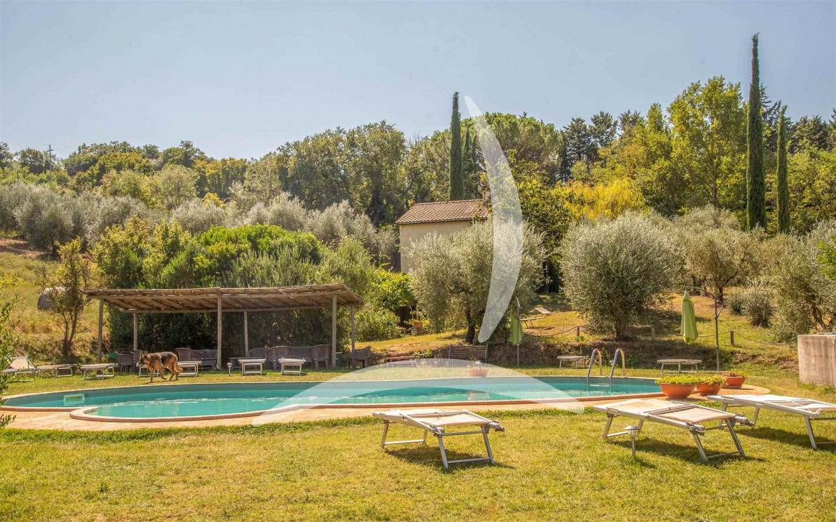 The panoramic swimming pool, renovated in 2019 with a new liner, filtration system, and saltwater purification, is the highlight of the estate. Three wells, municipal water, and an irrigation system provide reliable water supply for the gardens and olive grove.