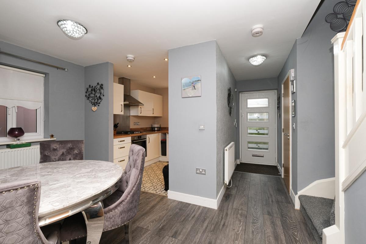 The entrance hallway leads to a useful ground floor cloakroom and a modern fitted kitchen with ample storage and workspace, seamlessly connecting to an open dining area -- perfect for everyday meals or relaxed social gatherings. To the rear, the extended lounge provides a generous living space overlooking the garden, offering a comfortable setting for relaxation or entertaining.