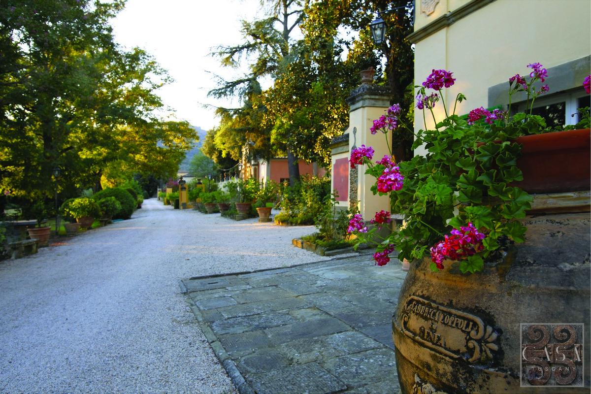 A wide, double staircase leads to the main entrance and looks out over the gardens, with its statuary and geometrical hedges. Typical of the Tuscan style for important manor houses, the Villa is a three storey, sizable rectangular-shaped building characterized by a simple elegance. The main entrance is located at the first floor under the family crest, and is accessible via the grand double staircase. The building has 28 rooms that have been recently restored; while features such as the marble fireplaces and the trompe l'oeil frescoes have remained purposefully unaltered.