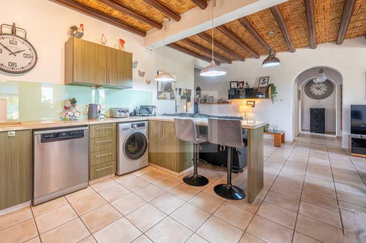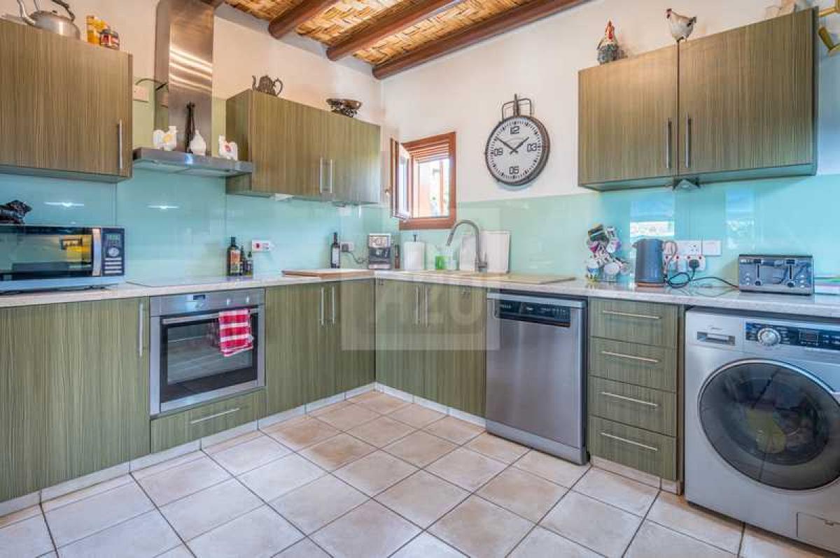 The focal points of the lounge is the characterful fireplace which is essential for the short Cyprus winter and the tradition beamed ceilings. In addition, the intelligent construction of numerous windows allows a large amount of light into the room with double glass doors going out to the covered patio and garden from the lounge and kitchen.