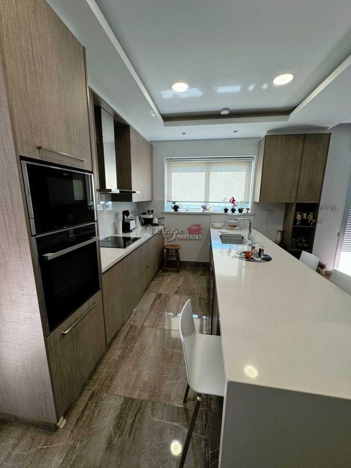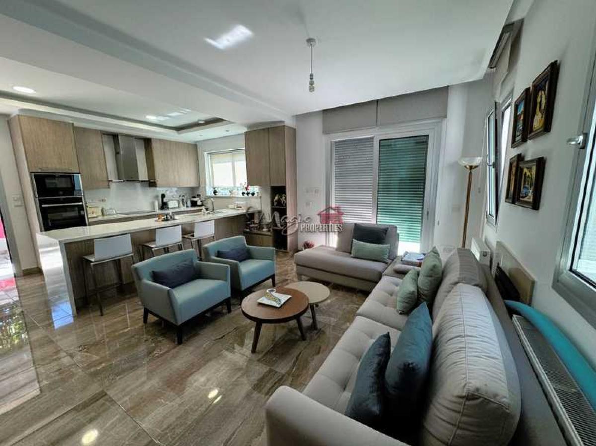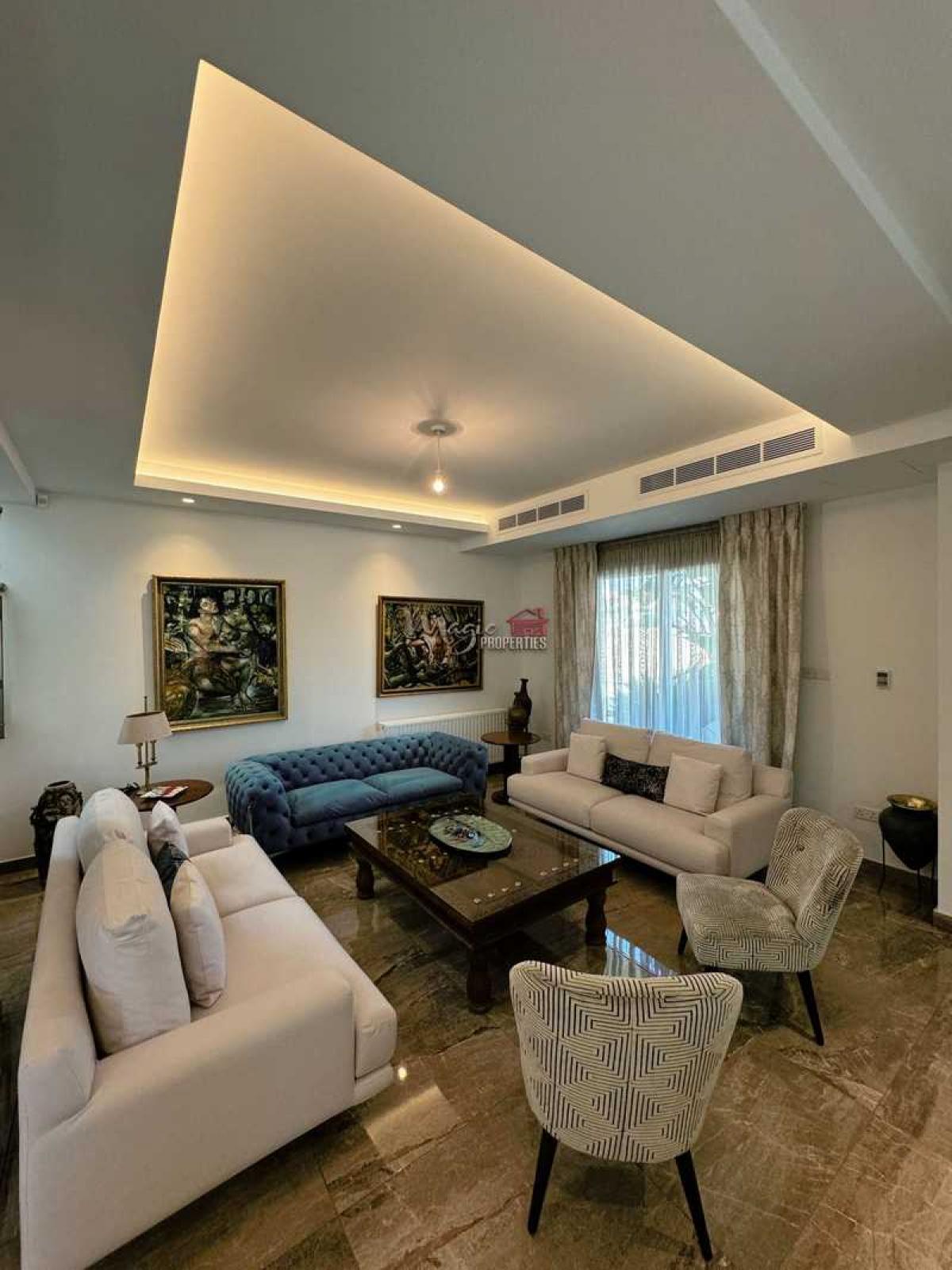 Resale 3 bedroom house + maids room with shower/wc in Ekali, Limassol.In ground floor you will find a spacious living room and dining table. Furthermore inside you entering the open plan kitchen area with another sitting area with comfortable couches. Also there is a nice guest toilet next to the stairs that leads to the upper floor.
