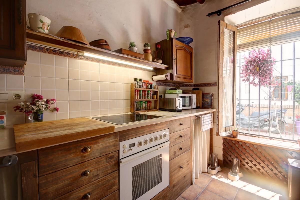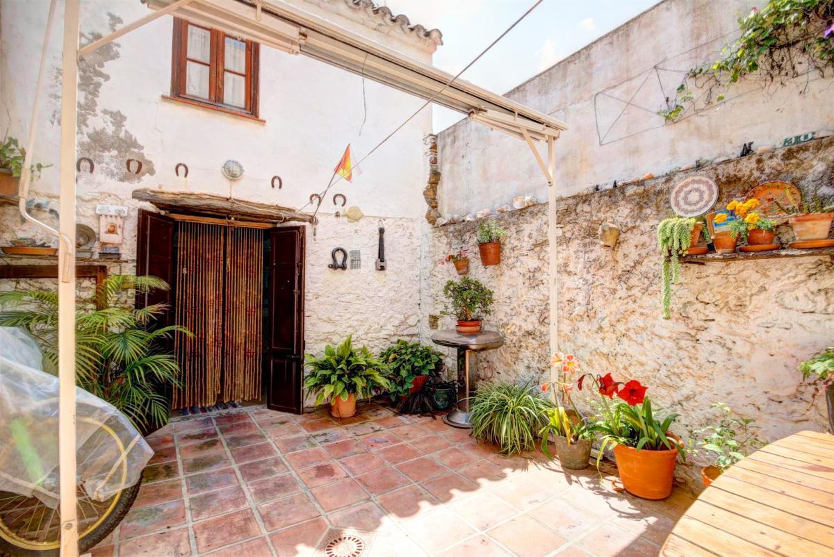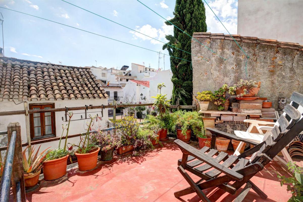 This charming property is located in one of the best areas within the old town, it is located only a couple of minutes walking to the beach and beside a beautiful square. The townhouse is distributed over 2 floors and conserves many traditional features such as wooden beams, a rustic charming patio and rock walls. The main entrance hallway is ample and has enough space for a wardrobe, alternatively, the kitchen which is beside the hallway, could be extended to incorporate this area. The living room and dining area is open plan and very spacious and it has a light-well in the centre which allows for natural light and fresh air. The main living areas lead into an additional room currently used as storage and office. From here you can access the charming ground floor patio which has an outer building used as a laundry room and a staircase leading to a terrace with views to the square. in addition the ground floor has a guest toilet located under the staircase.The internal staircase leads to the first floor which comprises; one large double bedroom with vaulted beamed ceilings, a spacious bathroom with shower place and bathtub, and a smaller double bedroom. There is a terrace on this level which is also used to access a further double bedroom with an en-suite bathroom. This room has a window looking into the patio below. The property was renovated 10 years ago with new installations for water and electricity; it's ideally situated close to local shops and convenience stores, and 100 metres from the largest and sandiest beach in Estepona. There is also approved permission from the town hall for the new owners to create a direct access into the patio from the square. This was obtained with the idea of creating a separate independent apartment of 1 bedroom and bathroom, and a separate kitchen, perfect for guests or short term rentals. Alternatively the property could be divided into 2 separate dwellings for rental purposes, and with some refurbishment it would be possible to make a boutique hotel.