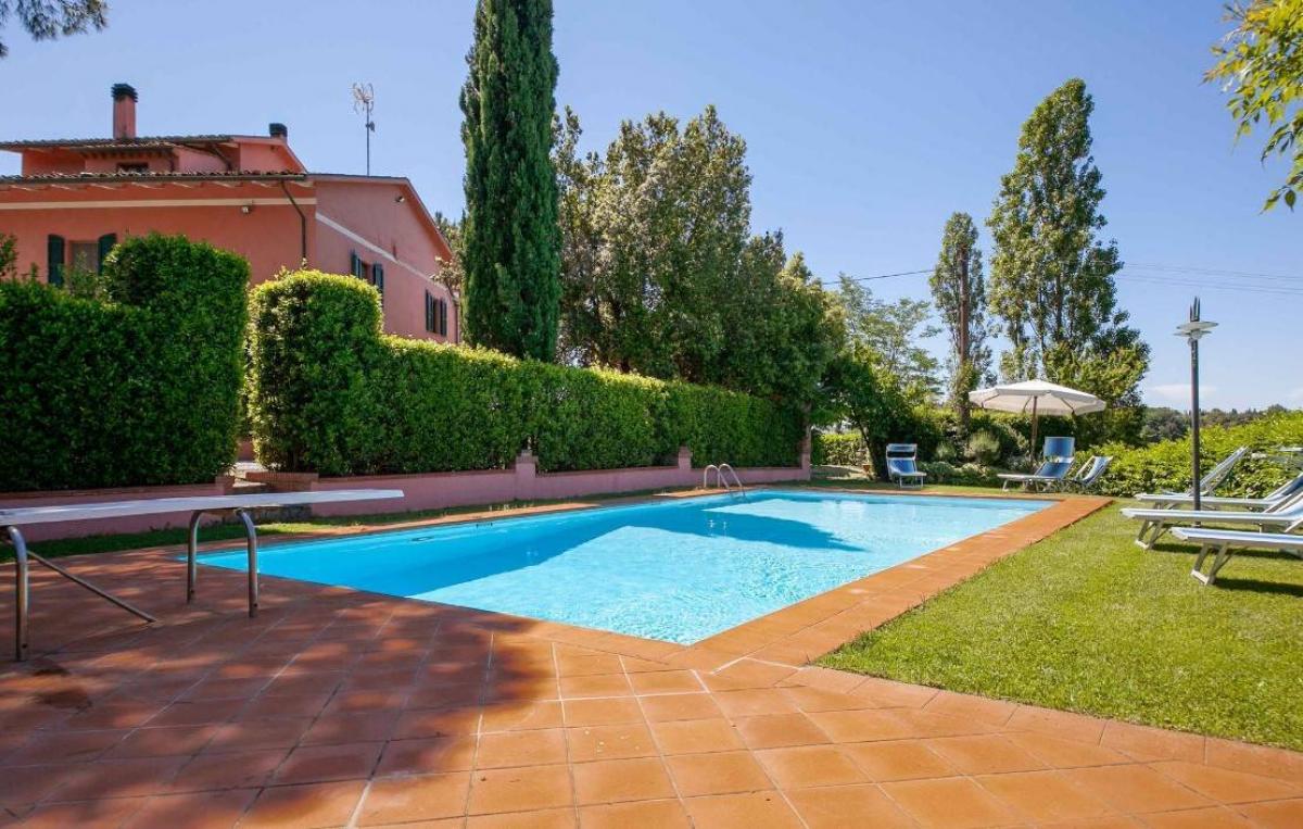 Set in the peaceful Tuscan countryside, the property spans 4500 sqm of land, which includes a private garden and cultivated areas. The meticulously maintained grounds feature a pool with demineralized water, creating a serene space for relaxation. Several outdoor areas are designed for dining, celebrations, or aperitifs by the pool, all with total privacy. The elevated position provides stunning panoramic views of the surrounding countryside.