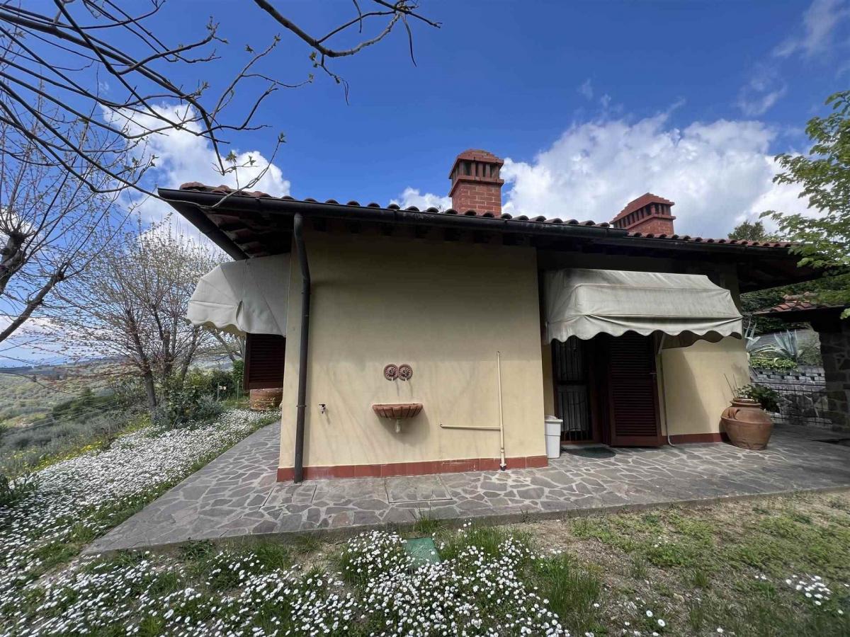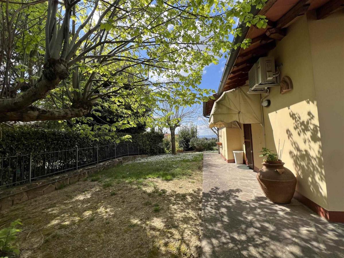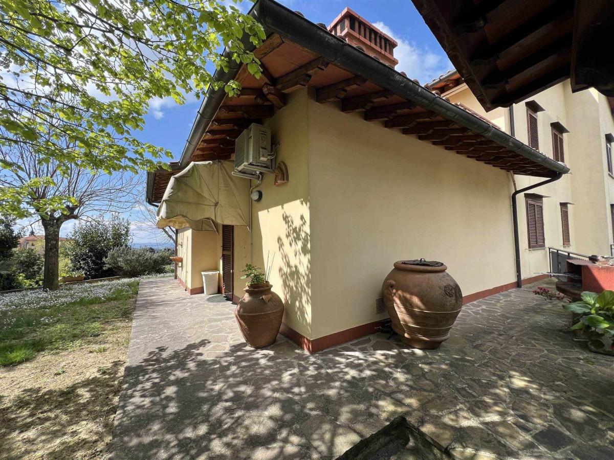 The private front garden provides a peaceful green space, while the panoramic terrace boasts stunning views over the Tuscan hills. A private garage and tavern/cellar add practicality to the property.