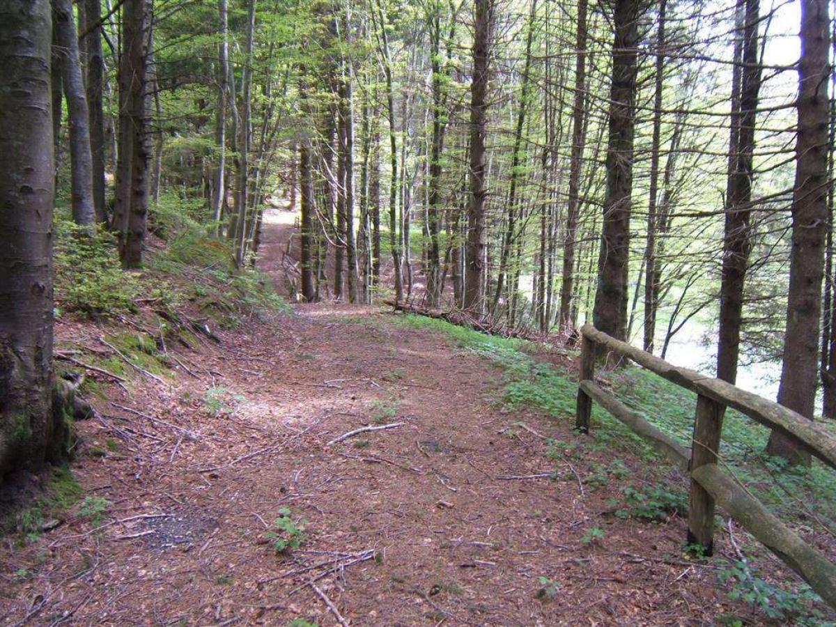 A pathway runs alongside the lake, leading directly to the chalet. The chalet, which needs renovation, is arranged over two levels. The ground floor features spacious cellars, while the first floor comprises an entrance, a bathroom, two bedrooms, a kitchen, a living room, and a balcony. The balcony offers stunning views of the lake and the surrounding mountain landscape.
