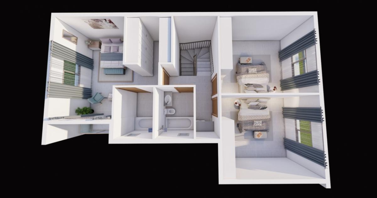 The original modern layout and interior plan propose to place the kitchen, living room, dining room and guest bathroom / shower on the ground floor. On the second floor, it is proposed to place three bedrooms, a family bathroom and another staircase leading to the roof with a with a furnished terrace, the area of which reaches 90 square meters and offers 360 degrees of panoramas!