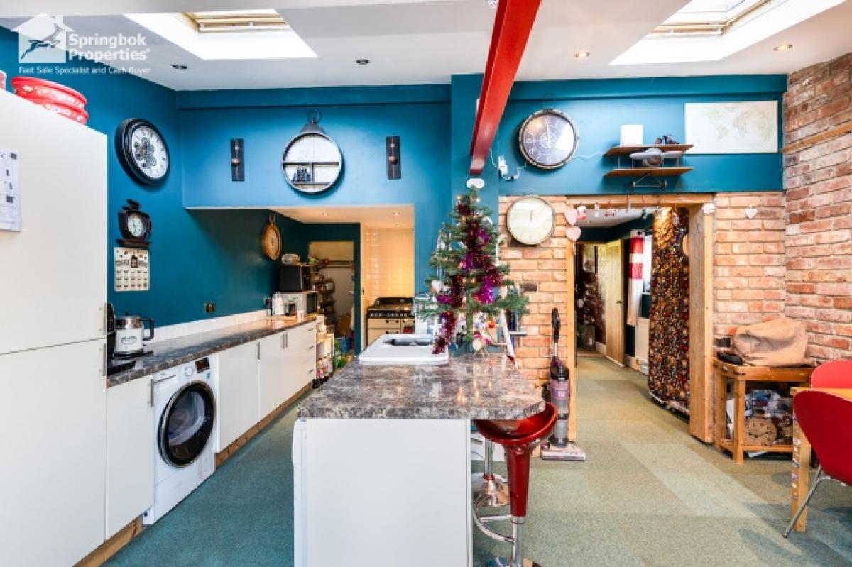 * Open-plan kitchen and dining area with skylights and exposed brickwork