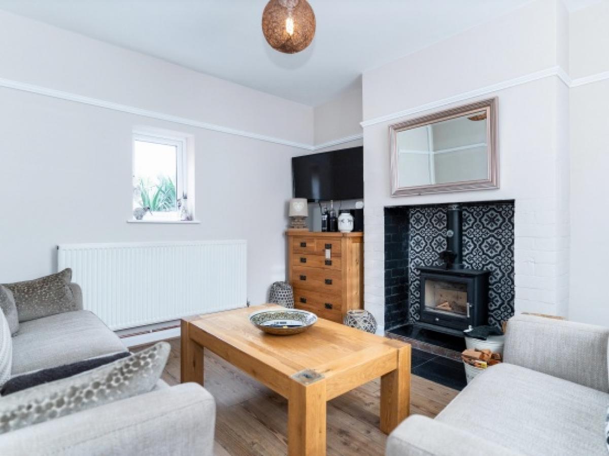 The brick frontage and neatly framed windows give an elegant first impression, while inside the layout offers a warm and comfortable setting with generous natural light throughout. A welcoming lounge features a wood-burning stove set into a beautifully tiled hearth, creating a cosy focal point and enhancing the period feel.