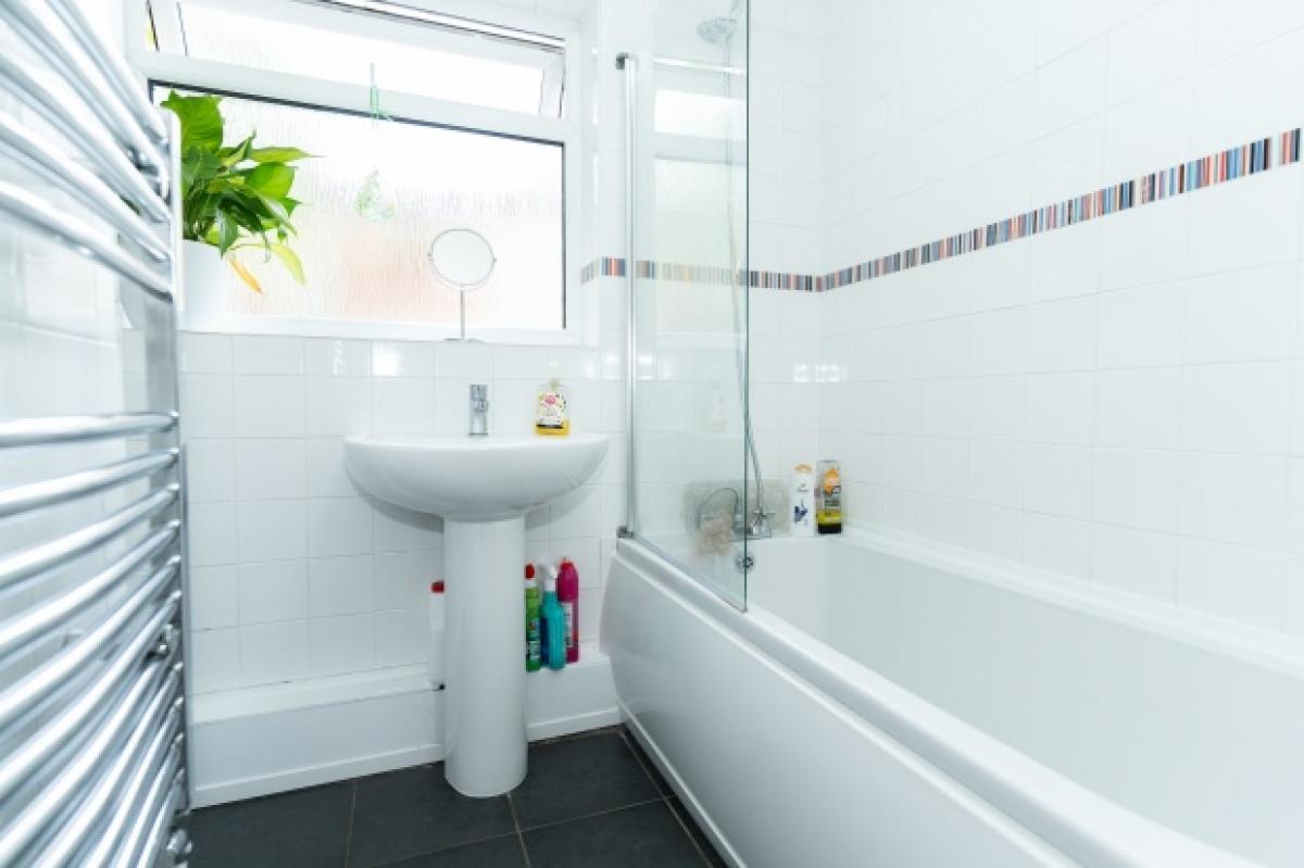 Upstairs the accommodation feels calm and inviting, with soft decor and good natural light, while the bathroom on the ground floor has clean modern tiling, a shower-over-bath and practical storage including space for laundry appliances.